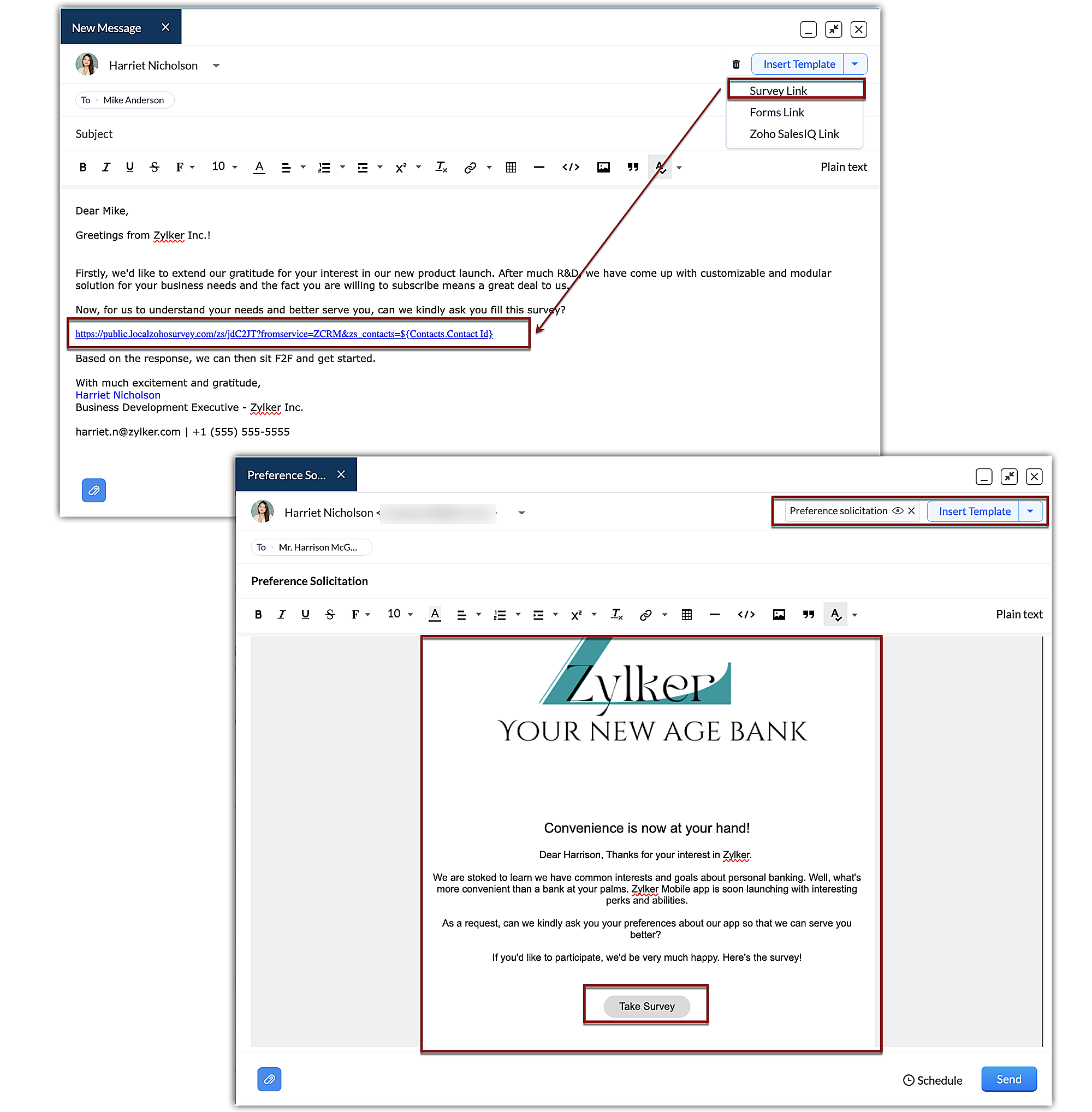 - Doar utilizatorii Zoho CRM pentru care permisiunea Manage Email Templates este activată în profilul lor pot folosi Insert Survey Link și crea un șablon de email.
