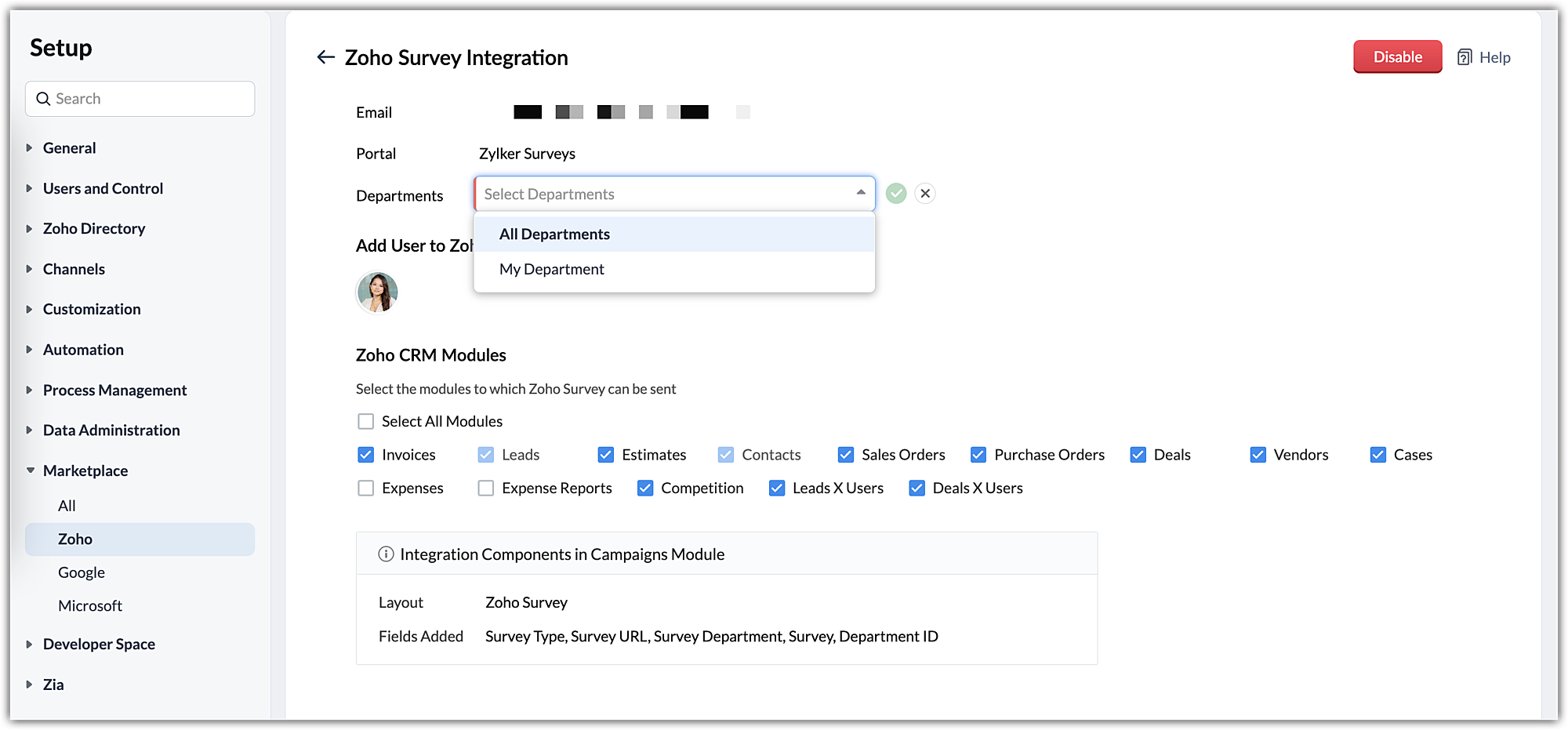 - Integrează Zoho CRM cu Zoho Campaigns, dacă nu ai făcut-o deja. Vezi și: Configurarea integrării Zoho Campaigns