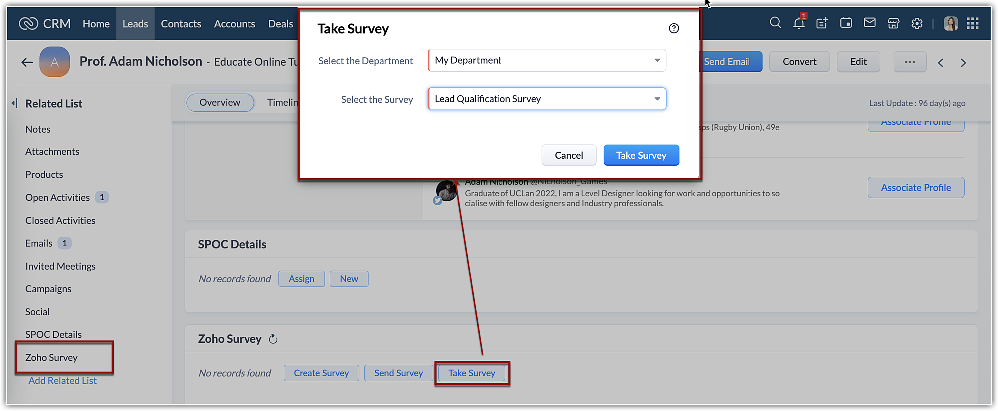 - Accesează înregistrarea dorită și selectează Zoho Survey din panoul listei asociate.