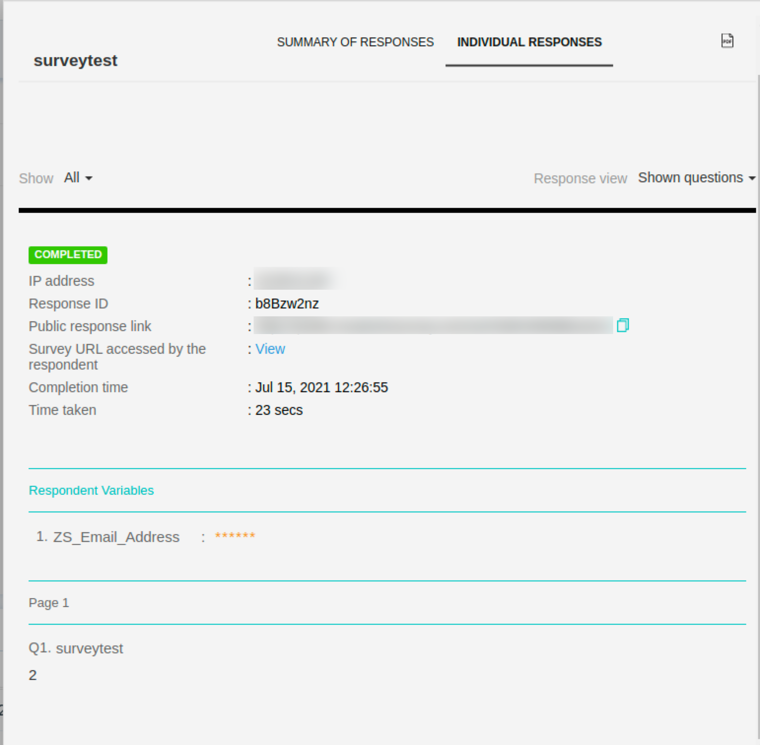 Notă- Linkul View Response poate să nu fie afișat în cazul în care respondentul a completat sondajul, dar ai folosit un serviciu de email diferit de Zoho CRM pentru a trimite emailuri în masă.