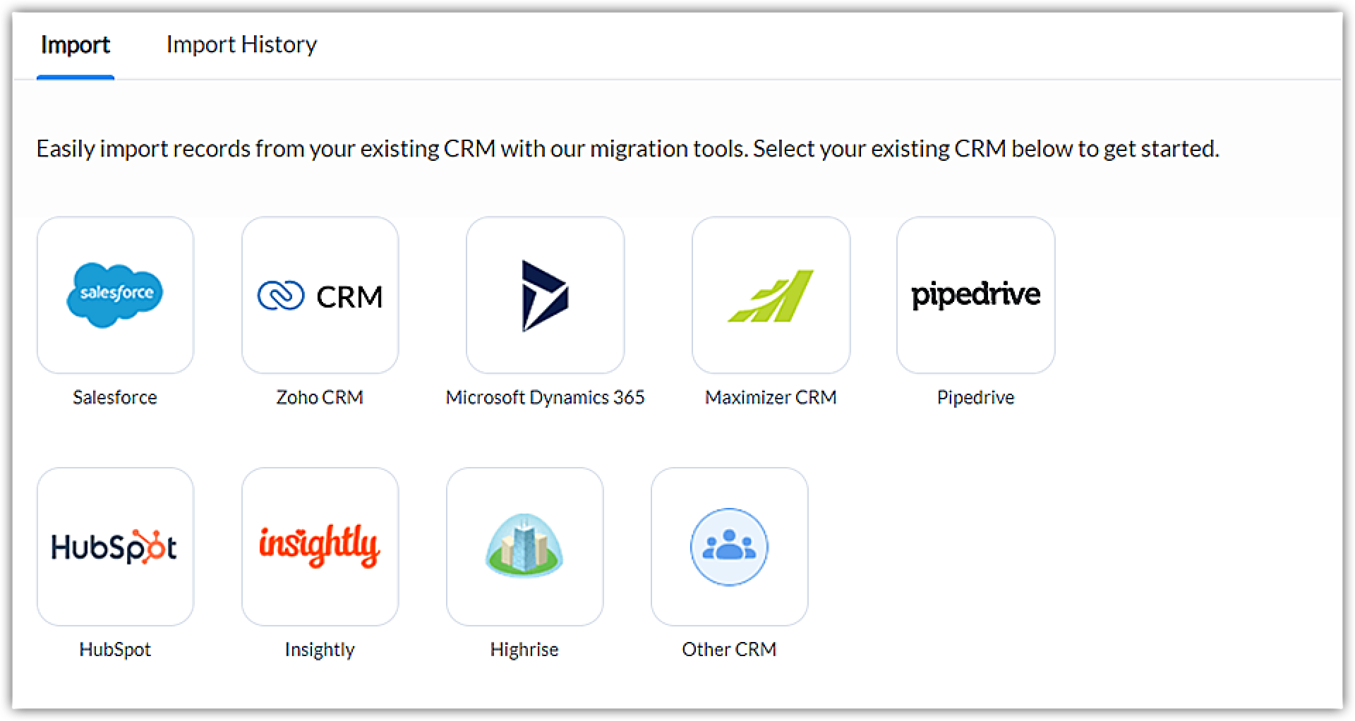 În contul tău CRM, mergi la Configurare > Administrare date > Import și apoi alege CRM-ul din care migrezi.