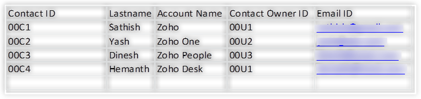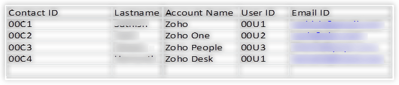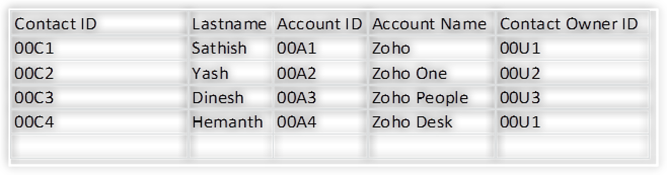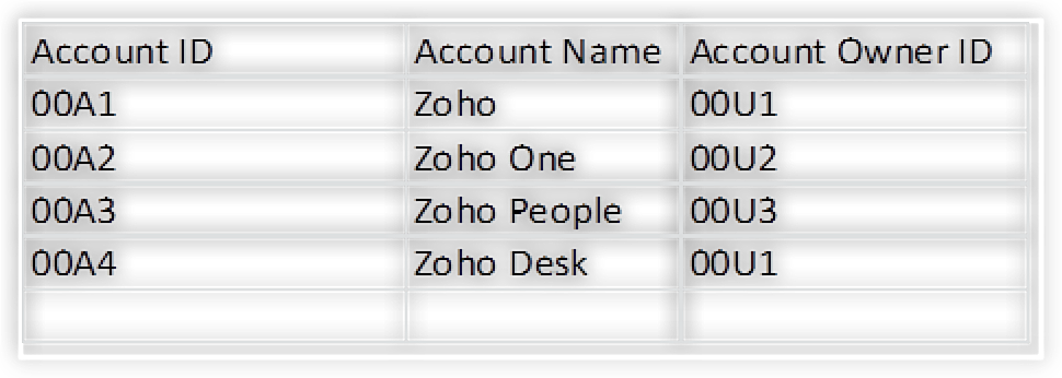 Mai sus este un exemplu de date cu generare manuală a ID-urilor — 00A1 este ID-ul folosit pentru contul ZOHO.