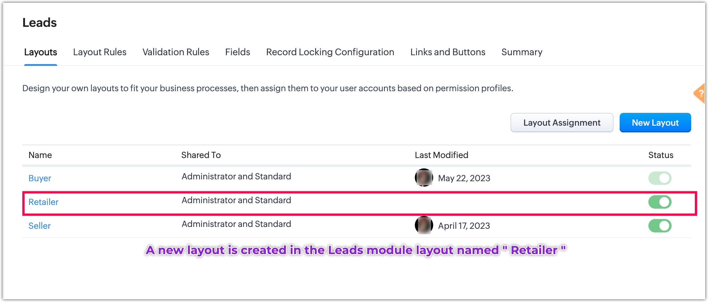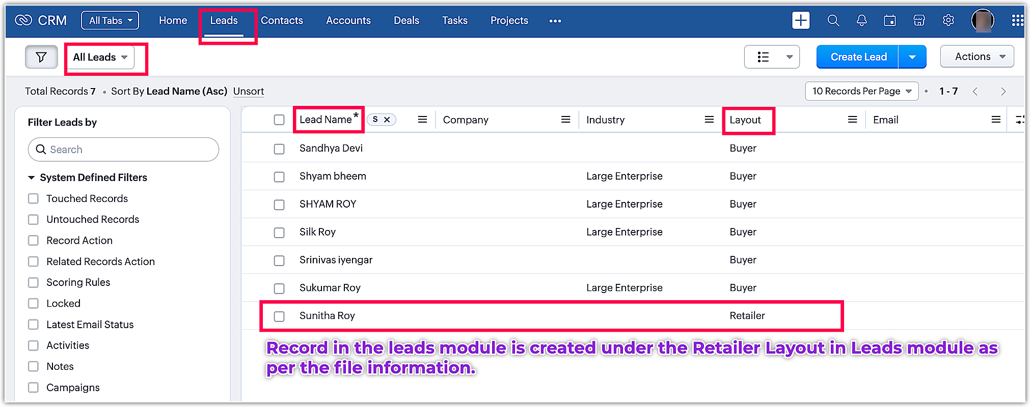 Odată ce datele sunt migrate, poți găsi layout-ul separat cu numele „Retailers" în modulul Lead-uri, iar înregistrarea de lead corespunzătoare va fi în modulul Retailers.
