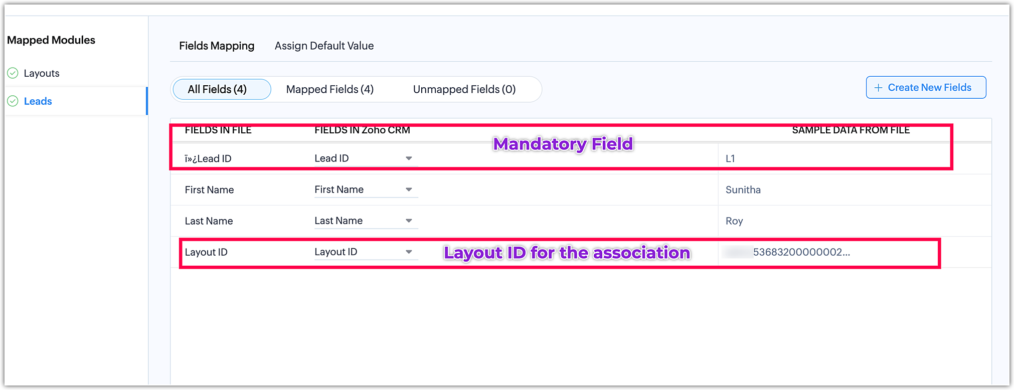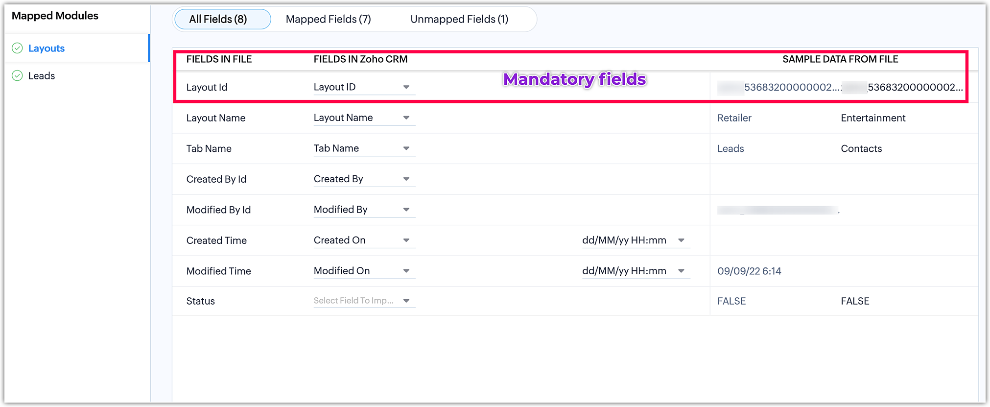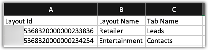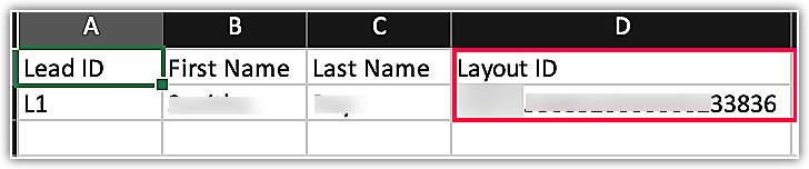 Să luăm un exemplu: dorim să migrăm datele de lead-uri în layout-ul respectiv al modulului numit „Retailer". Acum, uită-te la fișierul de lead-uri unde ID-ul layout-ului va fi prezent la fel ca ID-ul din fișierul de layout în rândul Lead-uri.