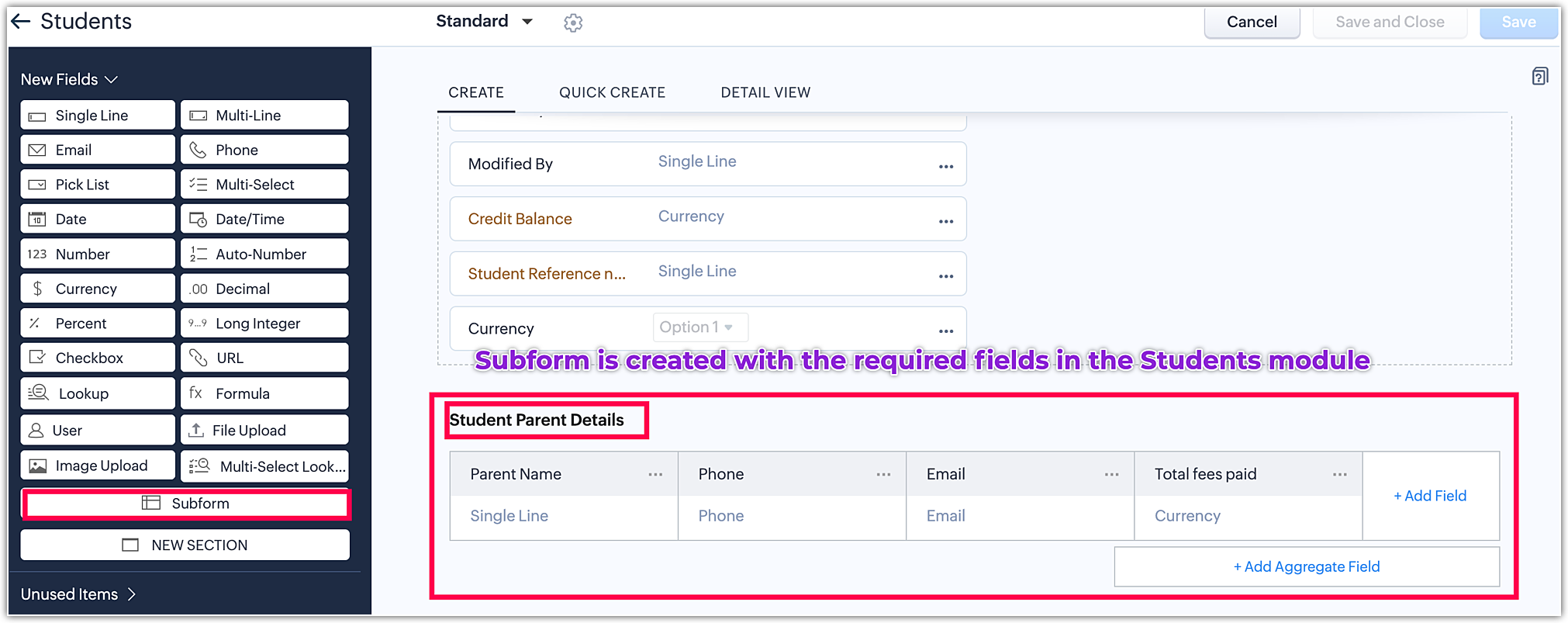 - Alege modulul în care trebuie creat sub-formularul. De exemplu, dacă ai un modul Studenți și ai nevoie de un sub-formular pentru introducerea detaliilor Student-Părinți, navighează la layout-ul studenților.