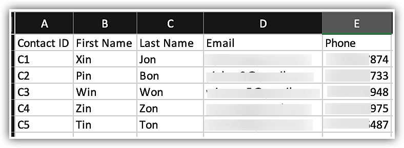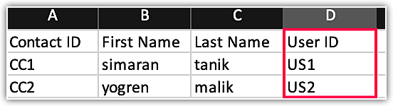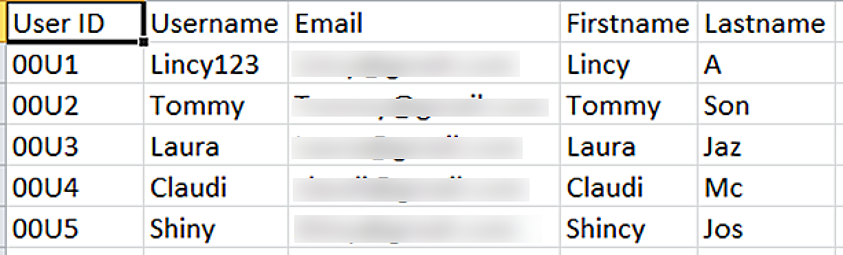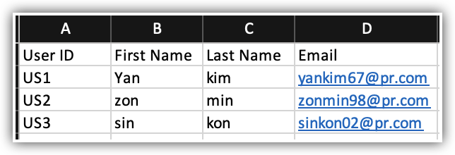 Fișierul user .csv trebuie să conțină prenumele, numele de familie, emailul și ID-ul utilizatorului. Aici, în tabelul de mai jos, poți vedea că ID-ul proprietarului este 00U1, 00U2, 00U3, etc.