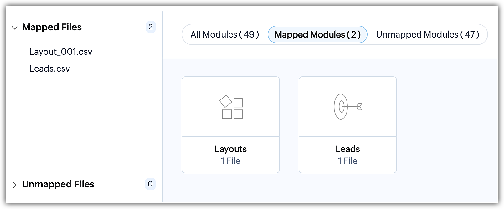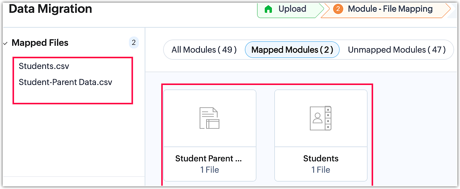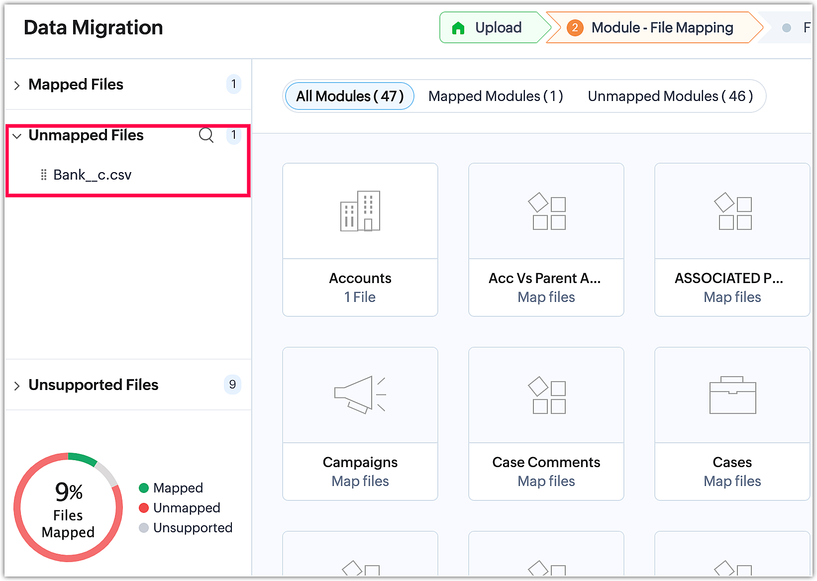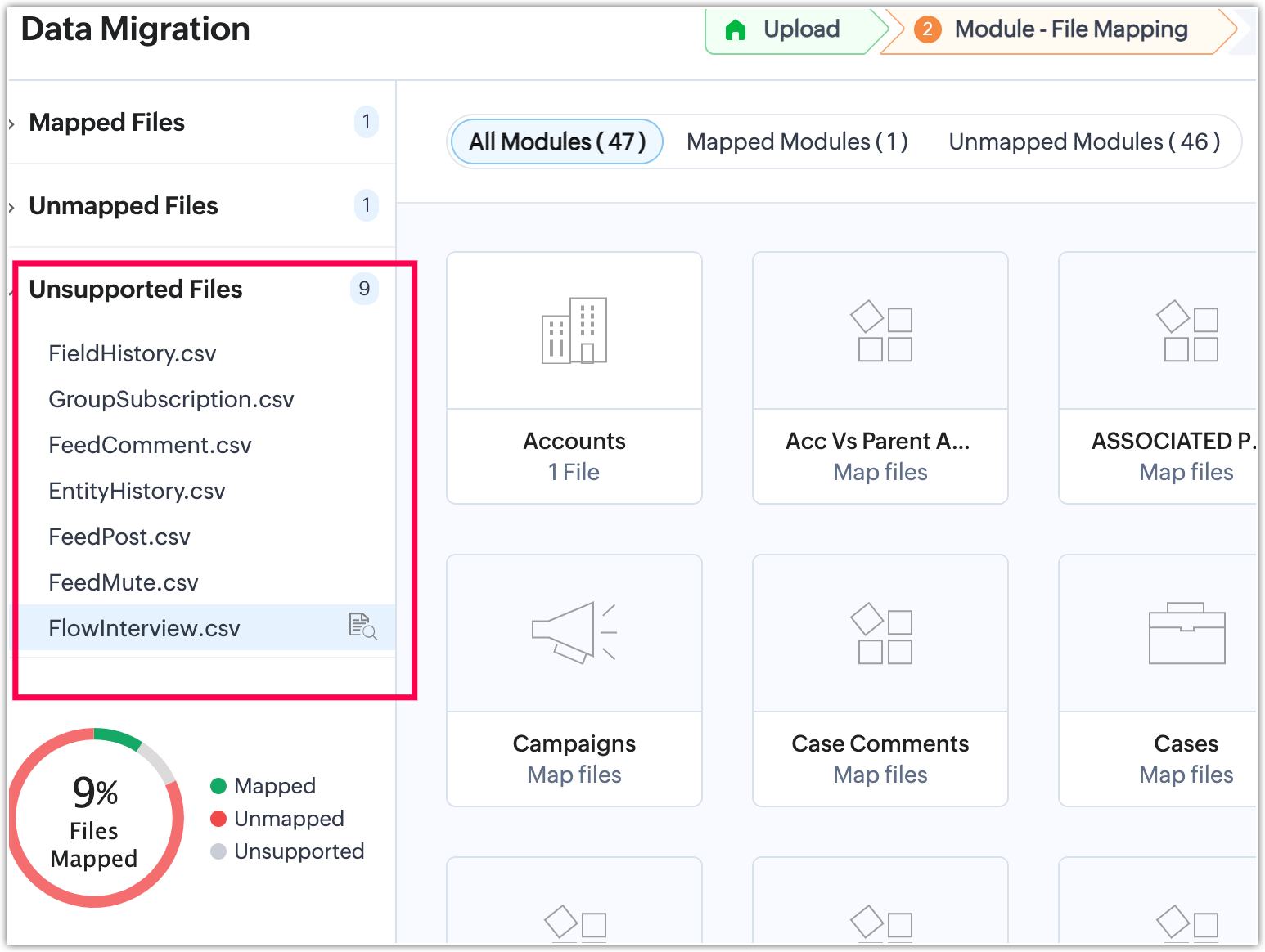 Pe de altă parte, fișierele nemapate sunt fișiere care conțin date, dar nu au fost încă legate de un modul existent sau create ca modul personalizat în etapa de mapare a modulelor. Mai mult, orice fișiere irelevante încărcate alături de un grup de fișiere sau în cadrul unui fișier zip vor fi recunoscute ca fișiere nemapate de sistem în timpul procesului de migrare.