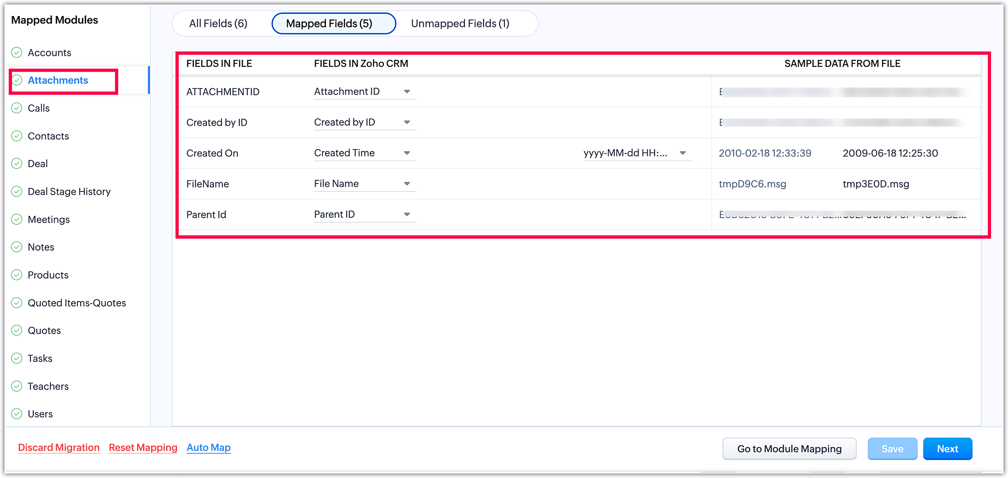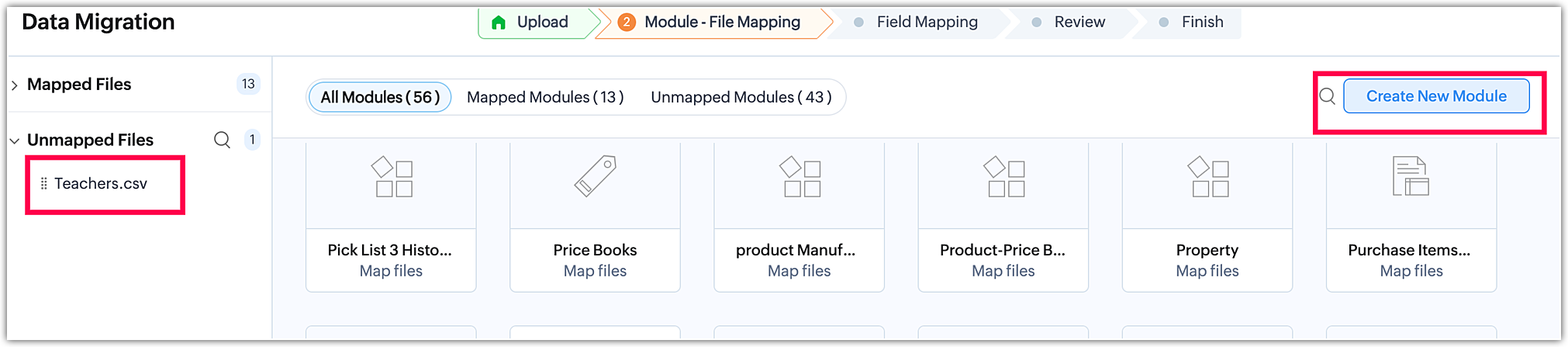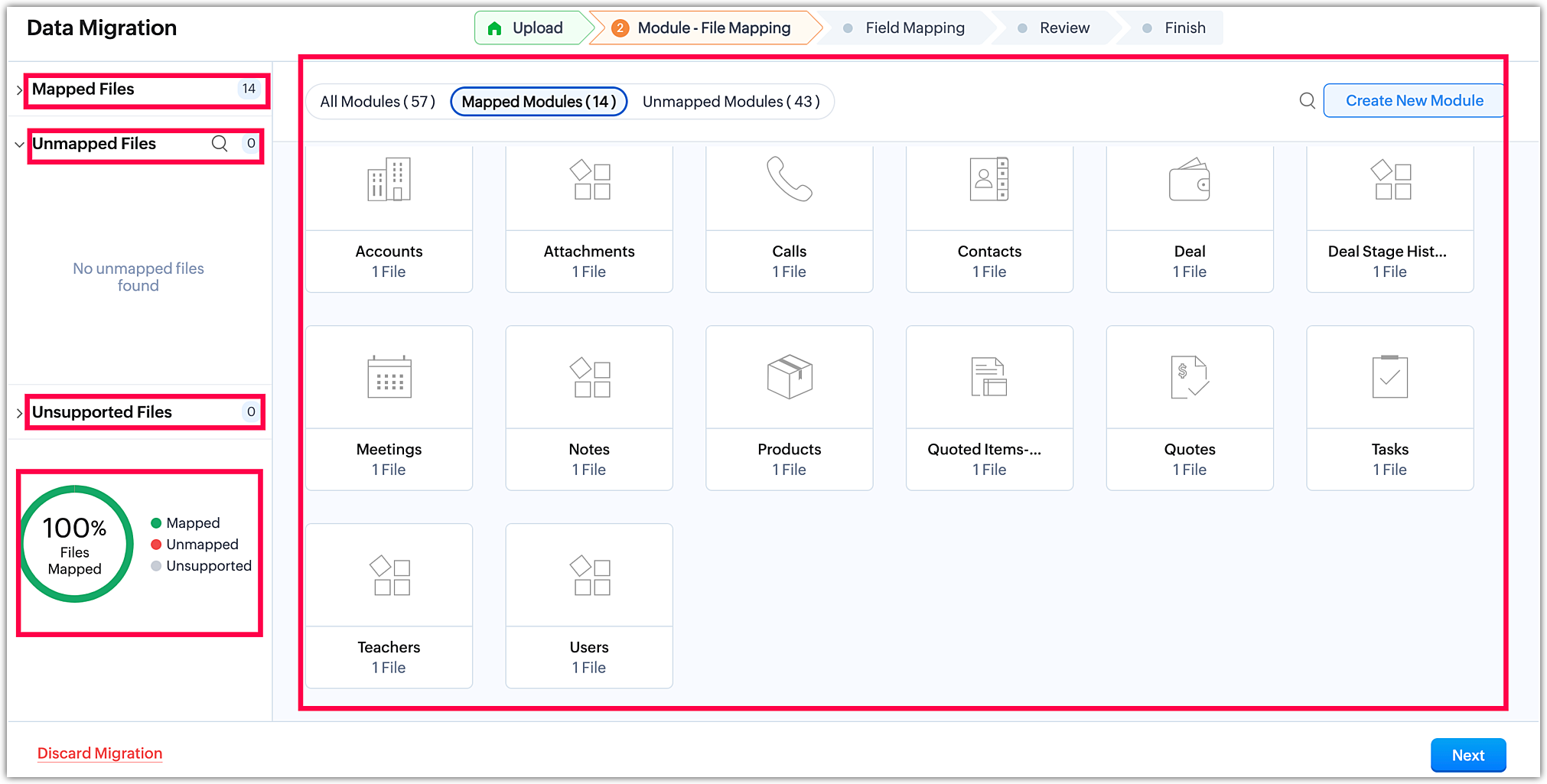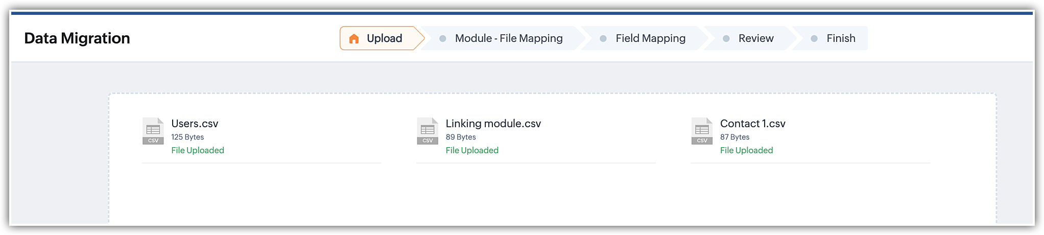 Pe de altă parte, fișierele nemapate sunt fișiere care conțin date, dar nu au fost încă legate de un modul existent sau create ca modul personalizat în etapa de mapare a modulelor. Mai mult, orice fișiere irelevante încărcate alături de un grup de fișiere sau în cadrul unui fișier zip vor fi recunoscute ca fișiere nemapate de sistem în timpul procesului de migrare.