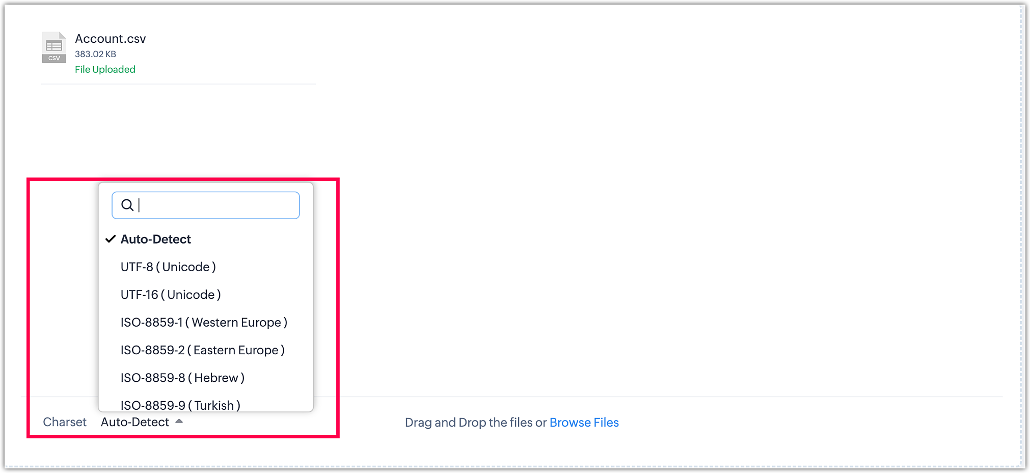 Când folosești opțiunea de detectare automată, sistemul identifică setul de caractere al fișierelor încărcate și continuă cu același set de caractere. Totuși, această metodă are limitări, în special când lucrezi cu fișiere care conțin un amestec de caractere engleze și caractere speciale. De exemplu, dacă un fișier are 20.000 de înregistrări și doar unele dintre ele conțin caractere speciale, detectarea automată ar putea identifica caracterele primelor 100 până la 500 de înregistrări (care pot lipsi caracterele speciale) și să continue cu același set de caractere pentru restul. Ca urmare, înregistrările rămase cu caractere speciale ar putea să nu fie migrate corect, ducând la valori incorecte.