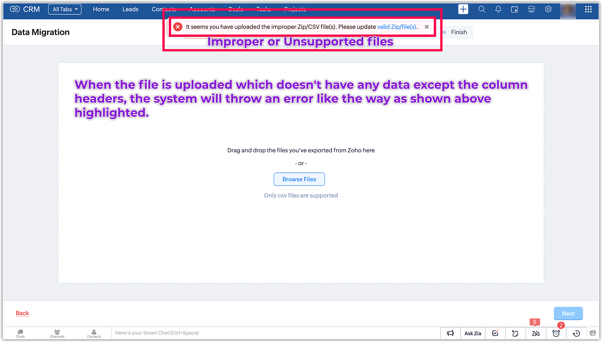 Formatul fișierului inserat este greșit: Acest tip de eroare apare atunci când formatul fișierului adăugat este altul decât fișierul .csv. Folderul Zip trebuie să conțină fișiere .csv în timpul migrării. Asigură-te că nu există alte subdosare în folderul Zip înainte de a-l insera, altfel această eroare va fi afișată.