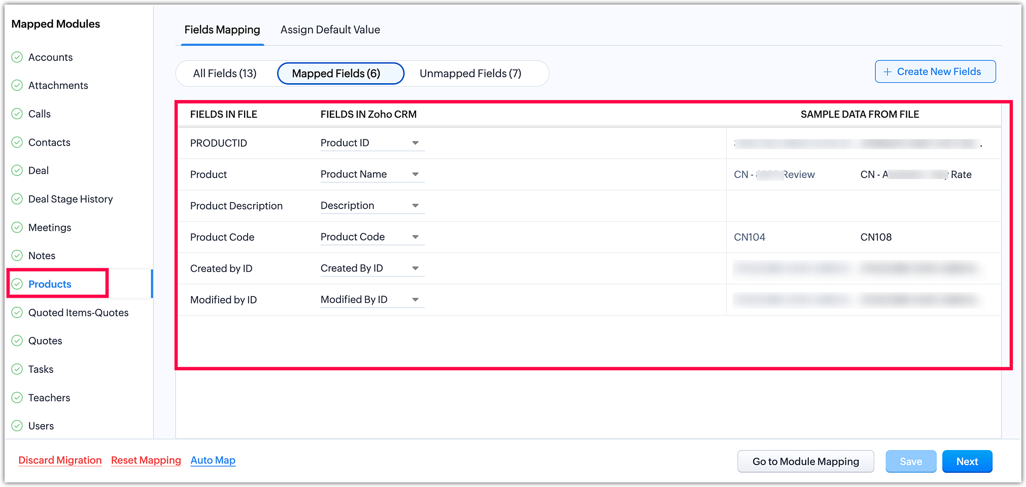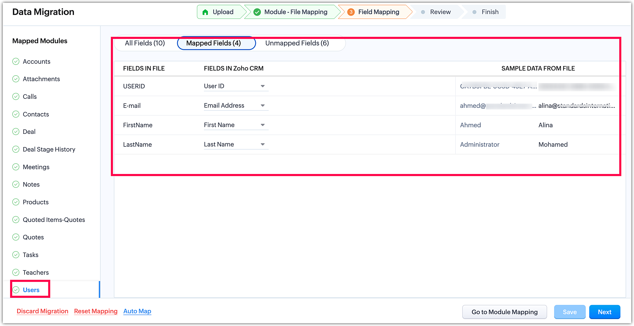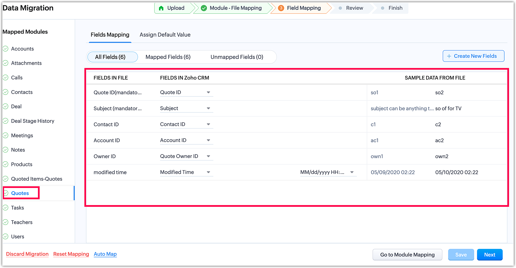 Odată ce ai finalizat maparea modulelor, fă clic pe Următorul în colțul din dreapta jos pentru a iniția etapa de mapare a câmpurilor.