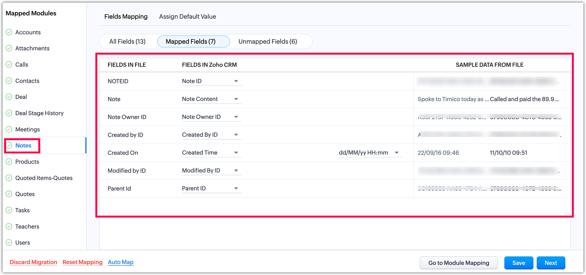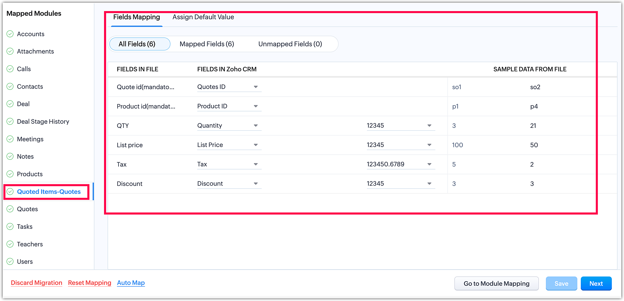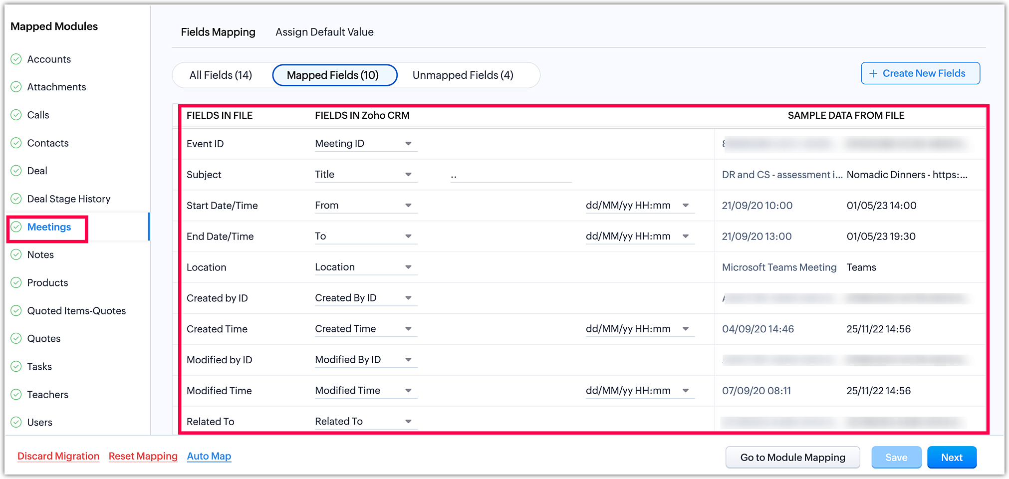 Odată ce ai finalizat maparea modulelor, fă clic pe Următorul în colțul din dreapta jos pentru a iniția etapa de mapare a câmpurilor.