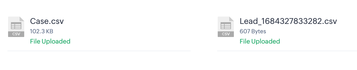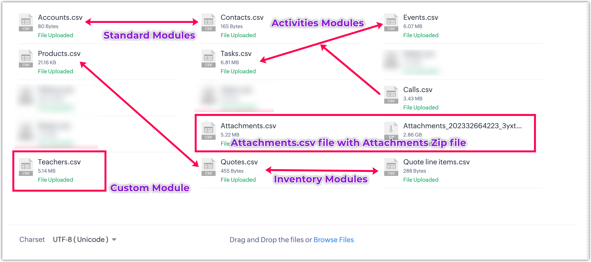 Alege widgetul CRM corespunzător și continuă să încarci toate fișierele necesare. Poți încărca fișiere legate de modulele standard, modulele de activitate, modulele de inventar și modulele personalizate. Dacă trebuie să încarci atașamente sau documente, asigură-te că încarci atât fișierul CSV de Atașamente sau Documente, cât și folderul corespunzător care conține atașamentele sau documentele, comprimate împreună. Acest lucru asigură o migrare fără probleme a tuturor datelor necesare și a fișierelor conexe.