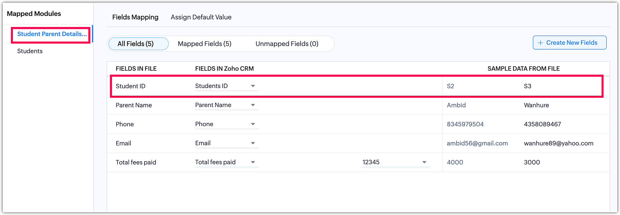 După cum se arată mai sus, poți efectua maparea câmpurilor fișierelor de module diferite.