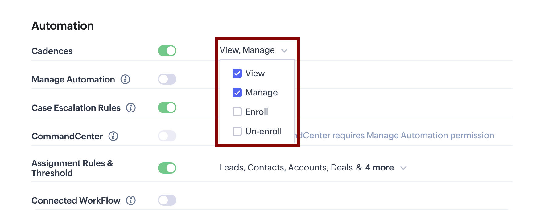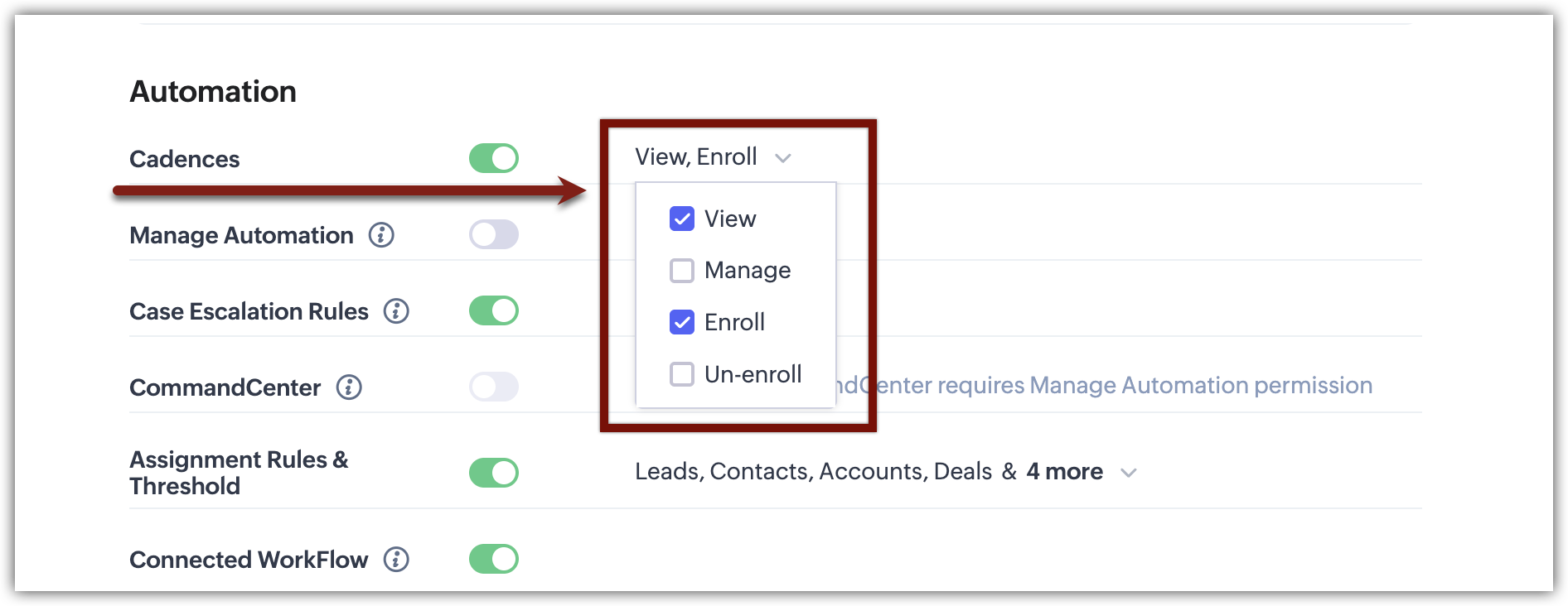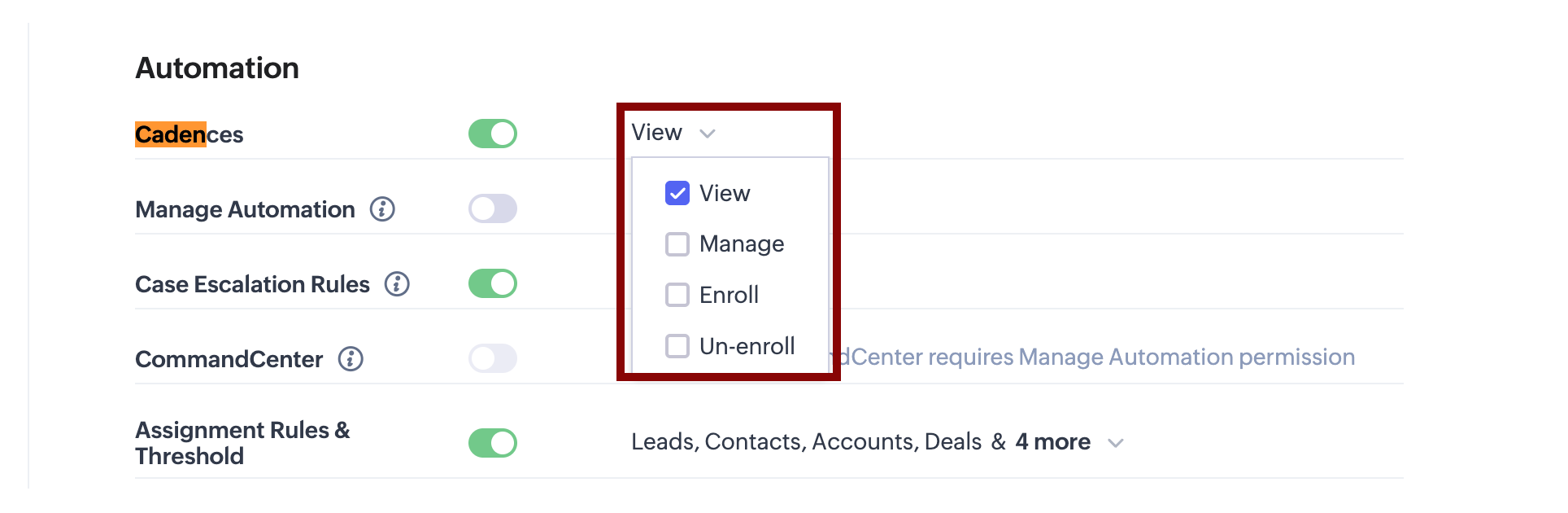 Cu toate acestea, utilizatorii care au deja permisiunea Gestionare Automatizare vor putea de asemenea să gestioneze Cadences, deoarece această permisiune activează automat toate permisiunile Cadences ca parte a accesului mai larg la automatizare.