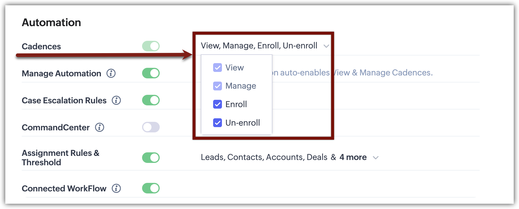 Dacă permisiunea Gestionare automatizare este dezactivată pentru un profil, utilizatorii admin pot totuși activa separat permisiunile Cadences. Pe baza cerințelor profilului, pot acorda permisiuni specifice precum Vizualizare, Gestionare, Înscriere sau Dezînscriere.