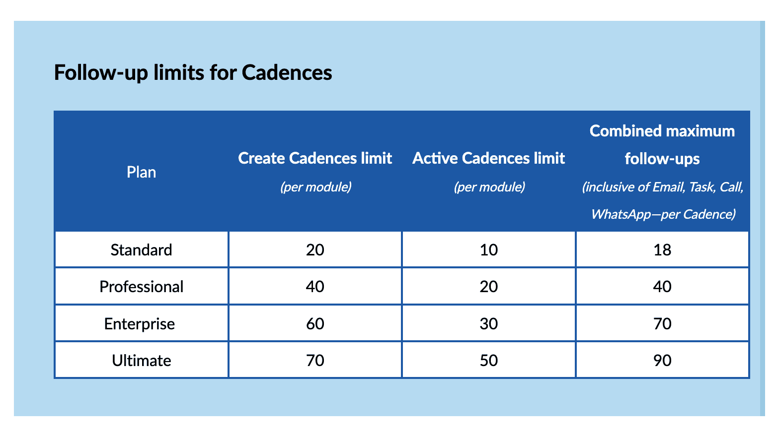 Nu, nu există restricții privind numărul de follow-up-uri. Restricția se bazează pe numărul de acțiuni (email-uri, apeluri și sarcini) care pot fi efectuate de cadences.