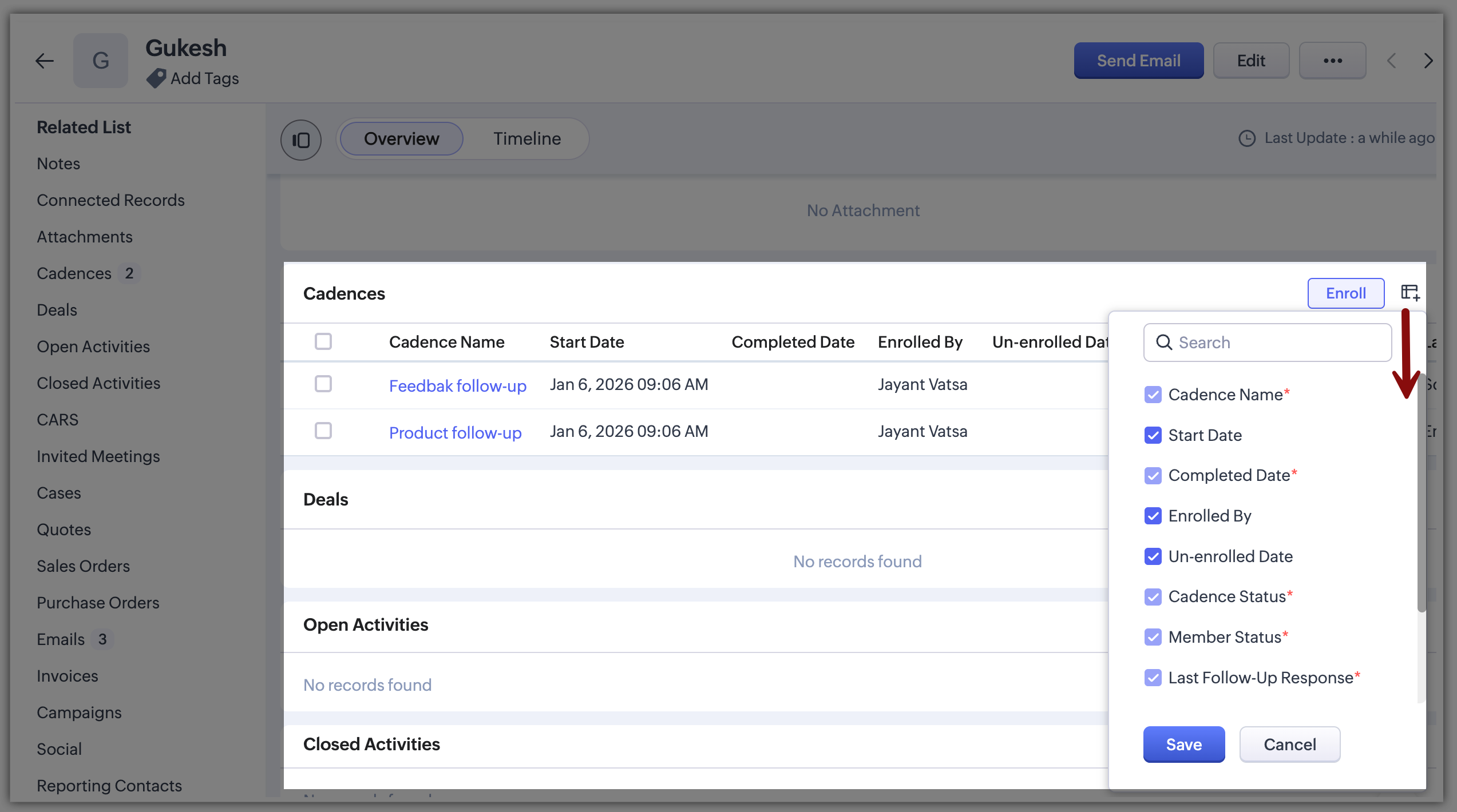 Când o înregistrare este adăugată la un cadence, lista asociată Cadences de pe pagina de detalii a înregistrării afișează toate informațiile relevante despre cadence. Poți personaliza și această listă asociată pentru a afișa doar coloanele de care ai nevoie, cum ar fi Data de început, Înscris de și Statusul Cadences etc.