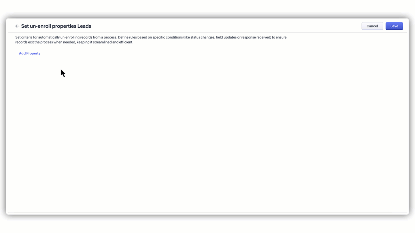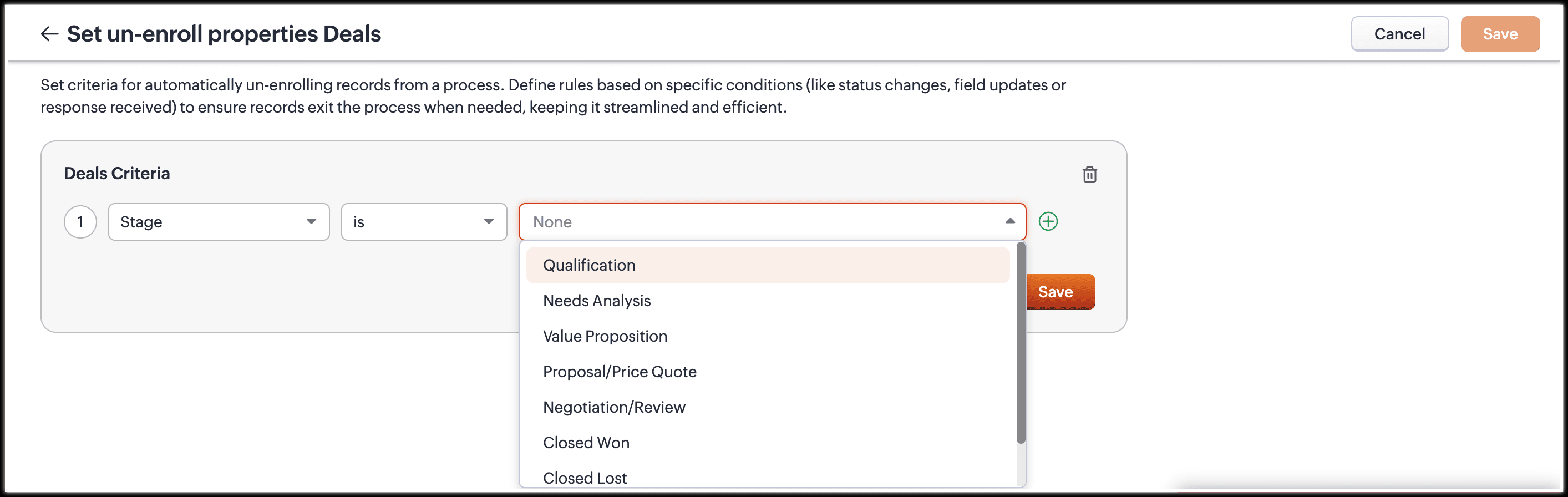 Un deal poate fi eliminat automat dintr-un cadence pe baza etapei sale Deal prin configurarea proprietăților de dezînscriere folosind criterii de înregistrare. Când etapa deal-ului se schimbă la valoarea specificată (de exemplu, Closed Won sau Closed Lost), sistemul dezînscrie automat deal-ul din cadence. Aceasta asigură că follow-up-urile se opresc odată ce deal-ul a avansat la o etapă în care nu mai sunt necesare acțiuni suplimentare.