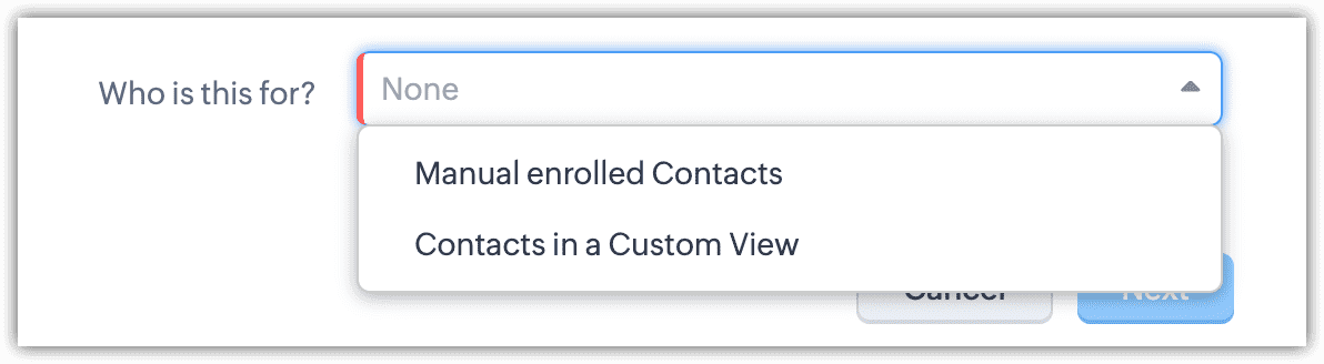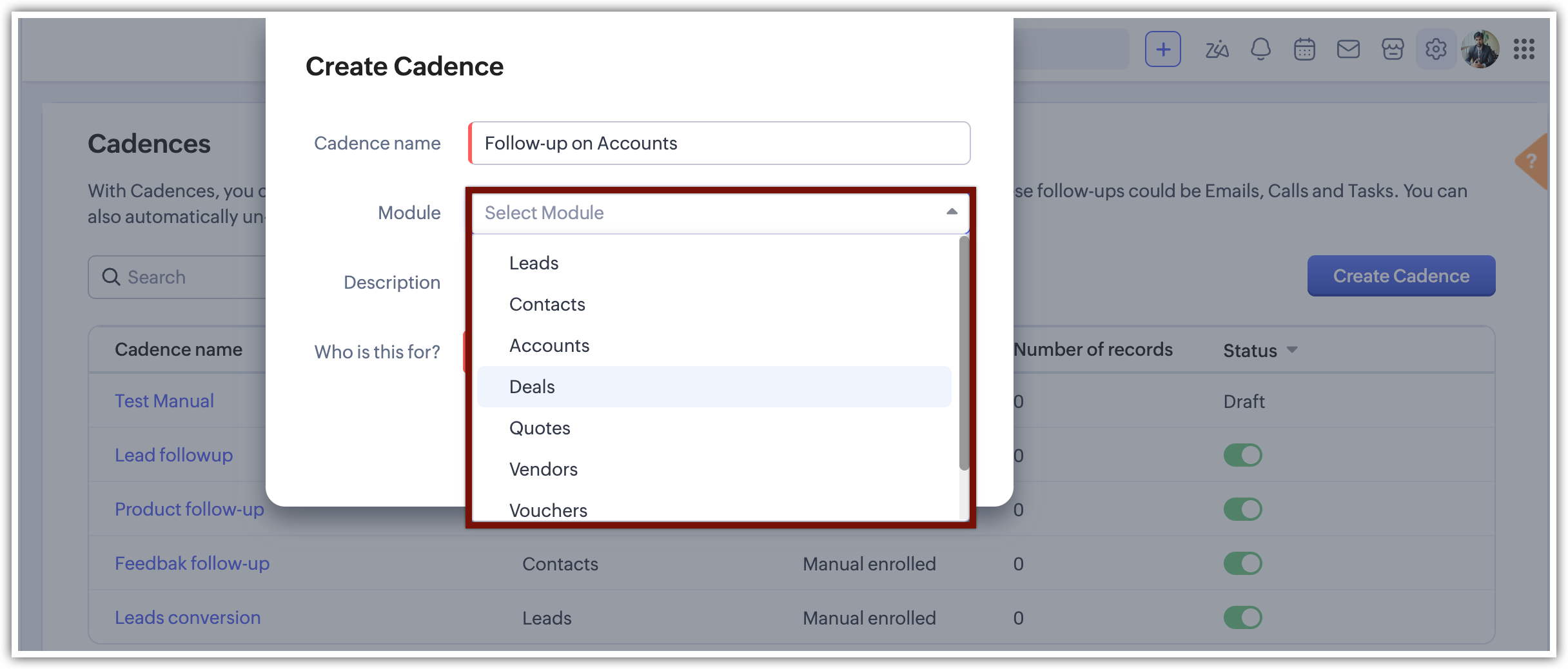 Cadences în Zoho CRM este specific modulului. Utilizatorul poate alege publicul țintă pentru Cadences din: