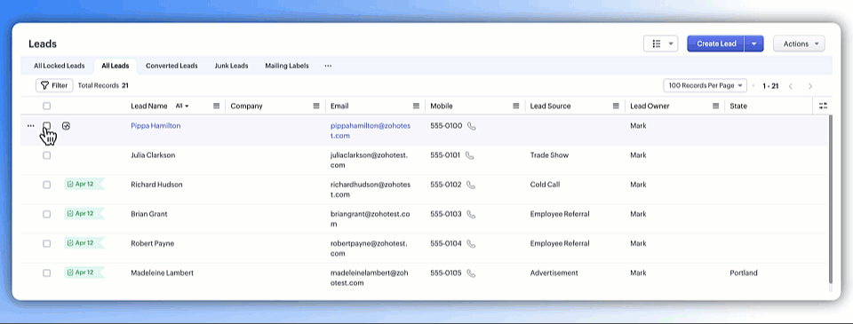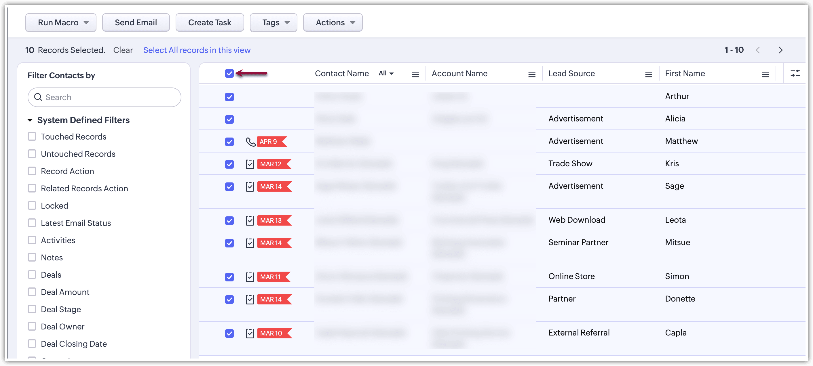 Notă: Poți viza înregistrări în toate modulele bazate pe utilizatori, atât cele definite de sistem precum Leads, Contacts, Deals, cât și module personalizate precum Vendors