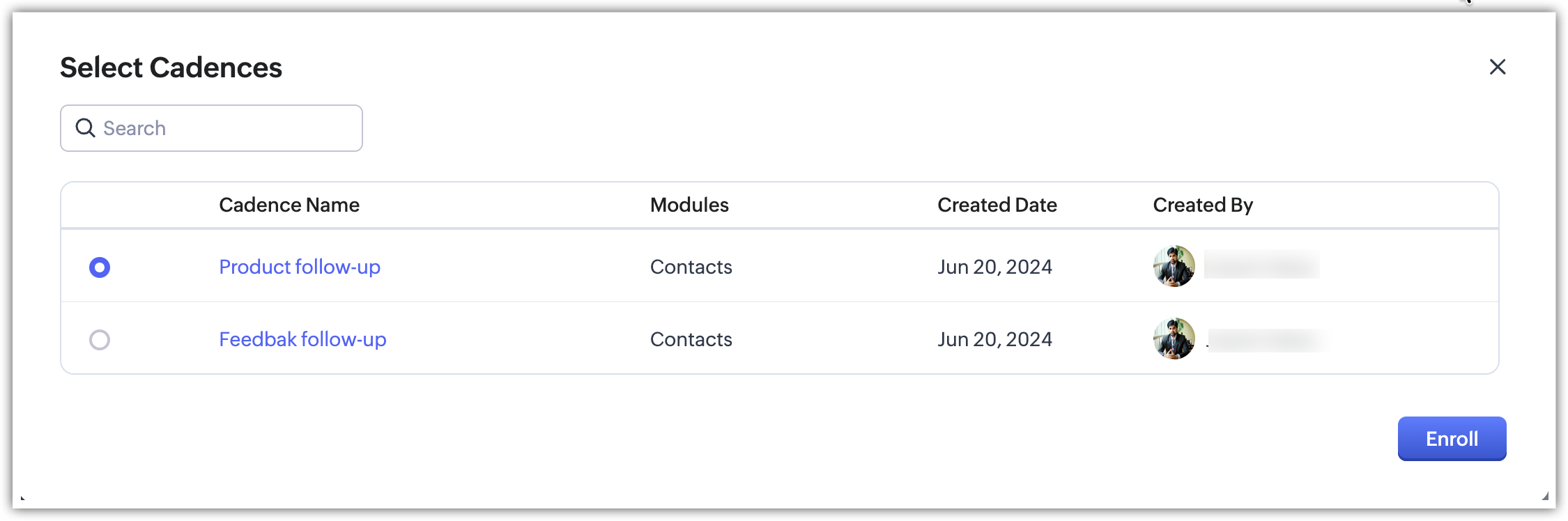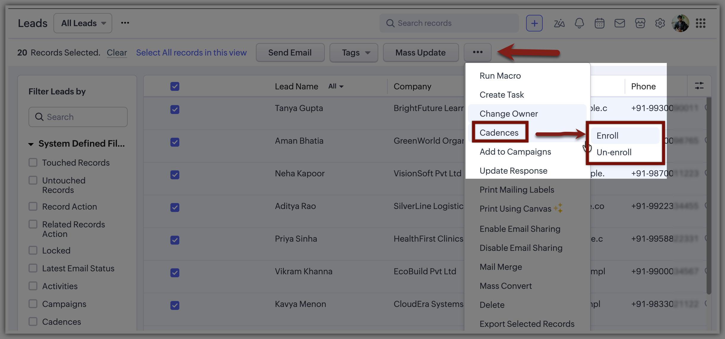 De exemplu: Un reprezentant de vânzări întâlnește un lead nou la o conferință și vrea să-l înscrie într-o secvență de follow-up imediat după introducerea detaliilor în Zoho CRM. Selectează lead-ul manual și îl înscrie în cadence-ul relevant pentru lead-urile noi de la conferințe.