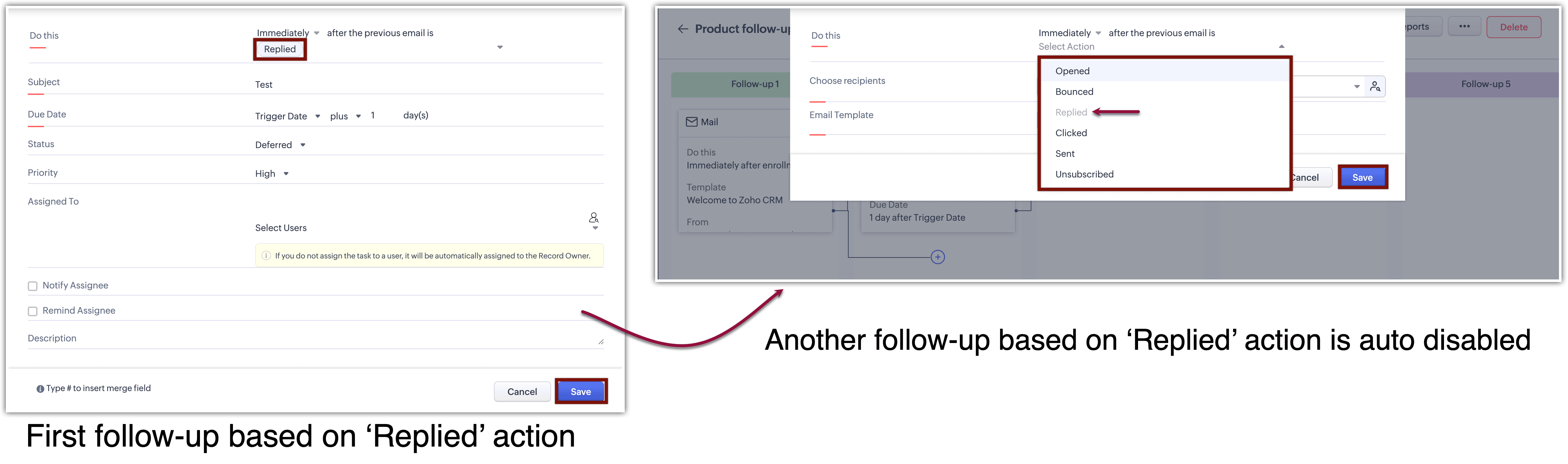 - La republicare, dacă un follow-up este editat și include înregistrări care sunt deja programate, Cadence-ul pentru acele înregistrări va fi marcat ca oprit, iar înregistrările vor fi dezînscrise.