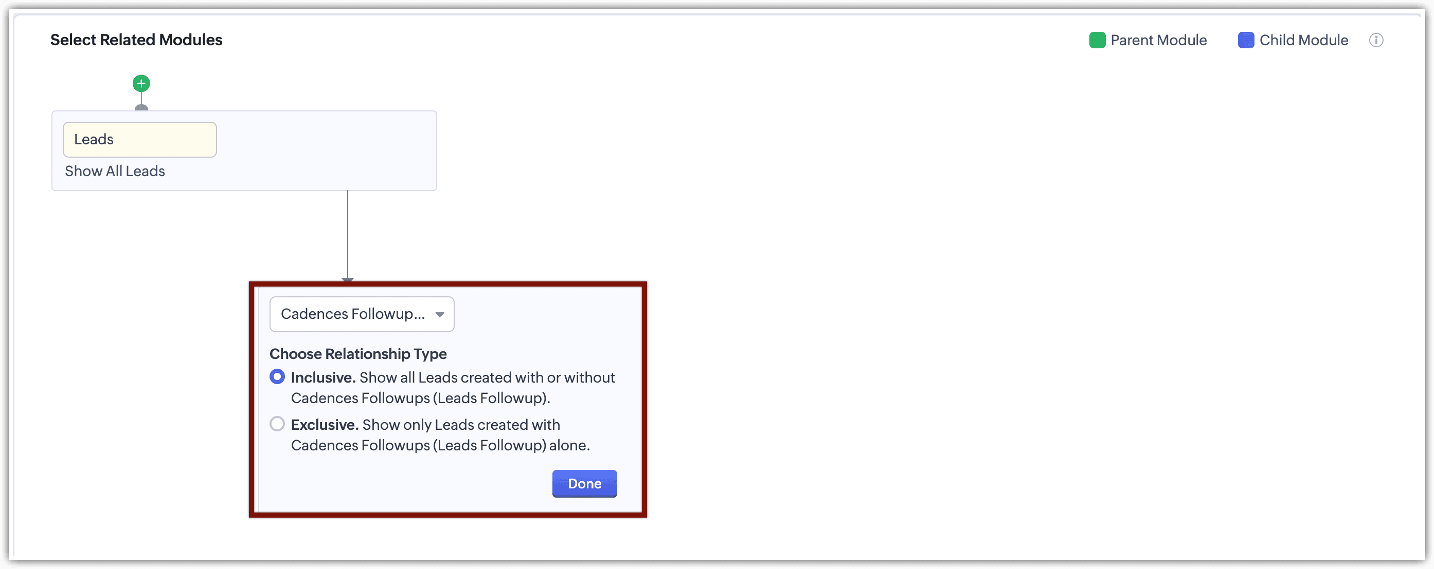 Selectează tipul de relație, Inclusive sau Exclusive, apoi fă clic pe Done.