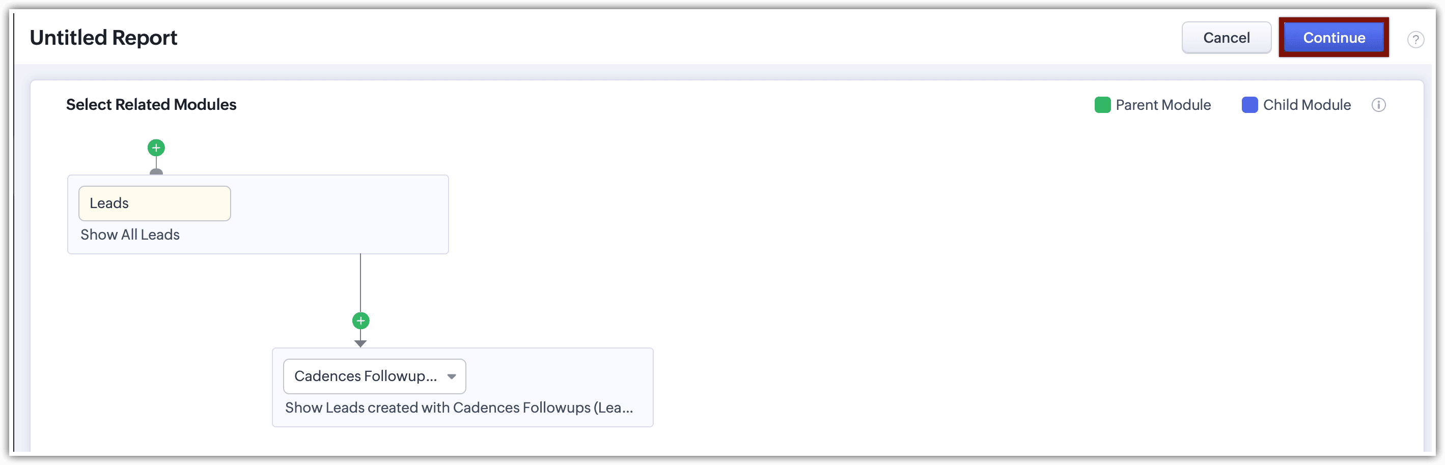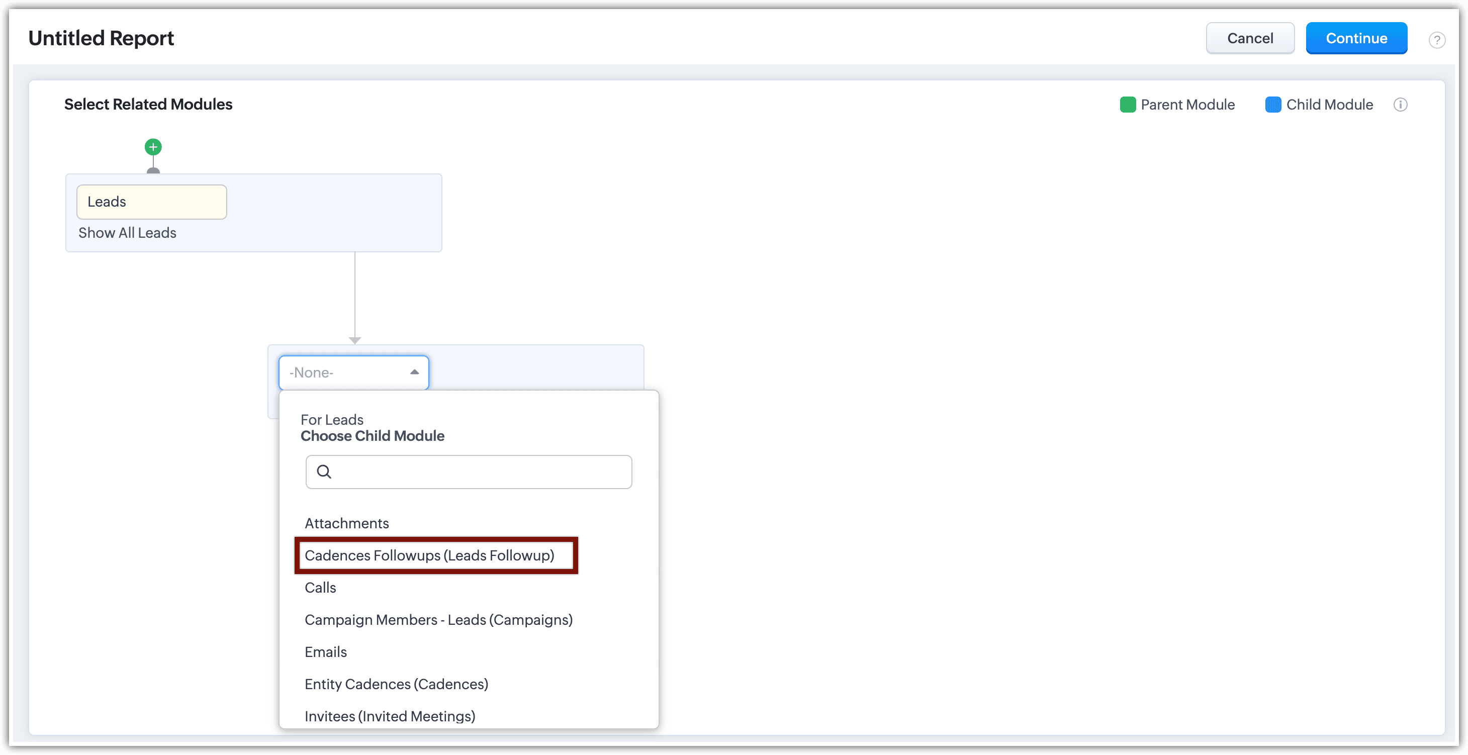 Pe pagina Reports, fă clic pe butonul +. Vei vedea opțiuni pentru a alege module copil. Selectează cadences din listă.