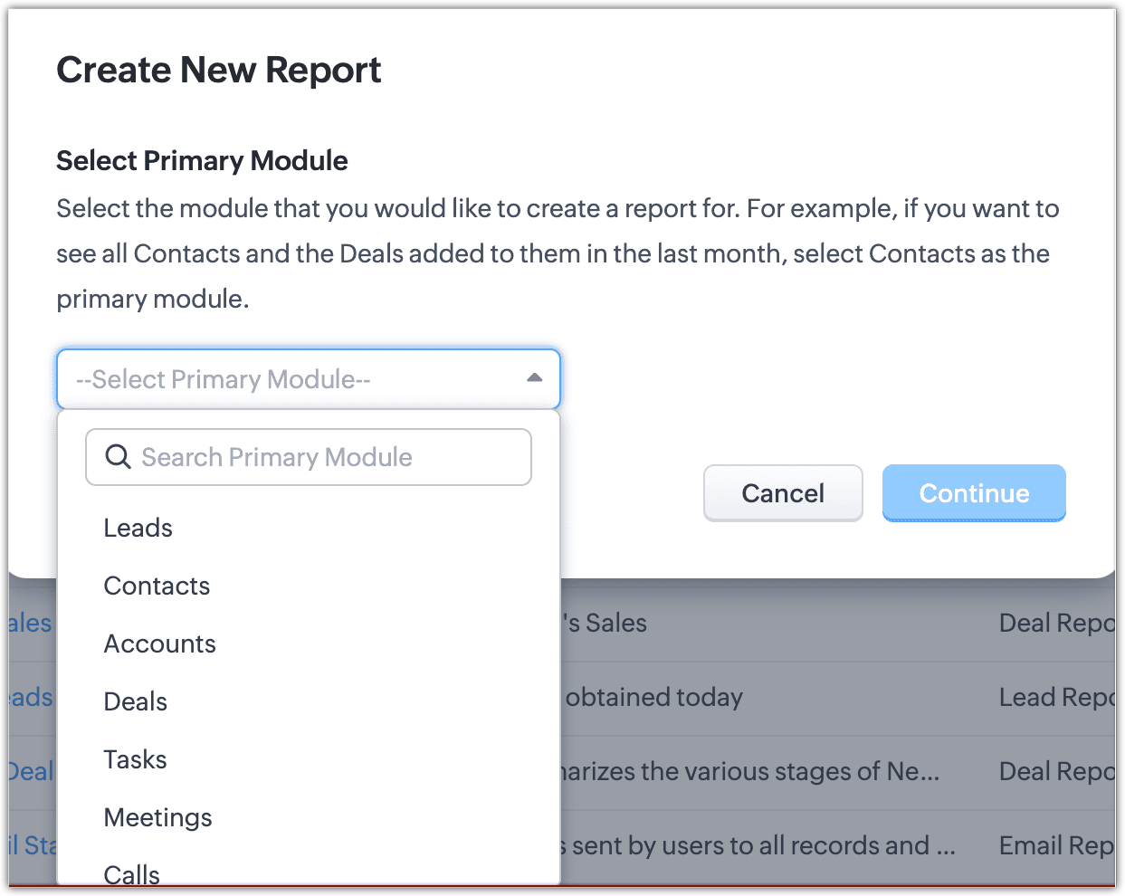 Continue. (Pentru cadences, alege din modulele Leads, Contacts, Deals, Vendors sau Assets).