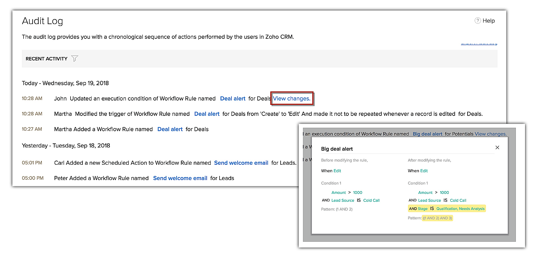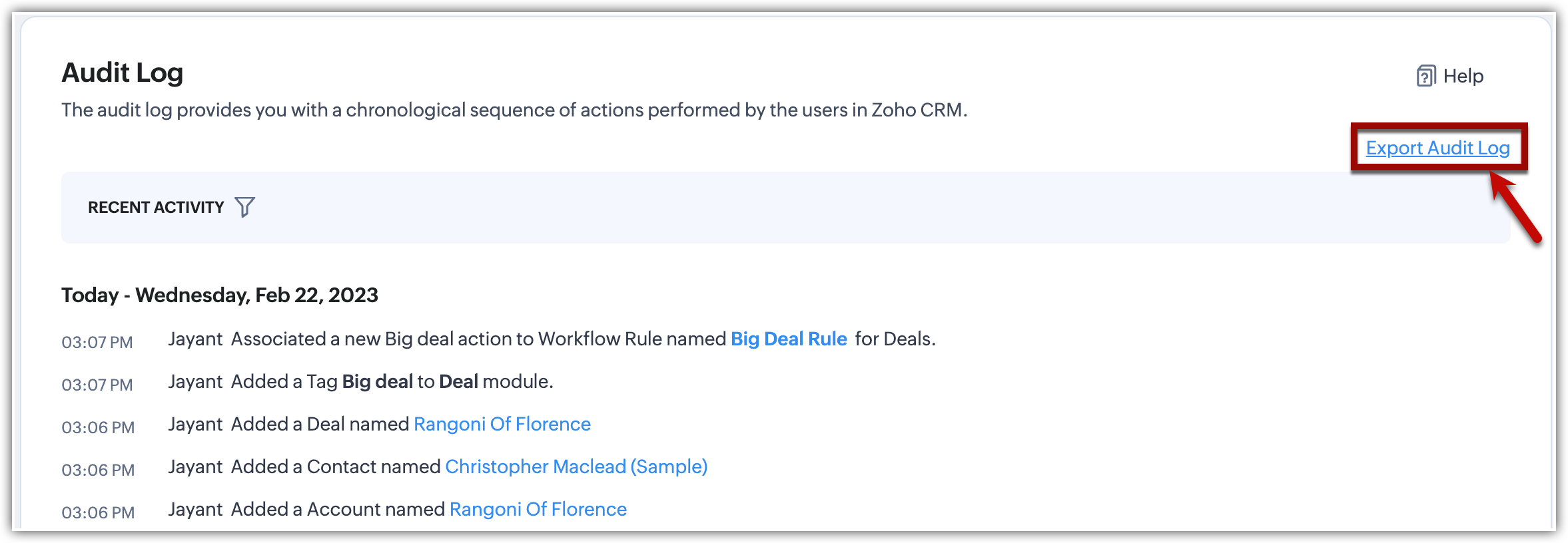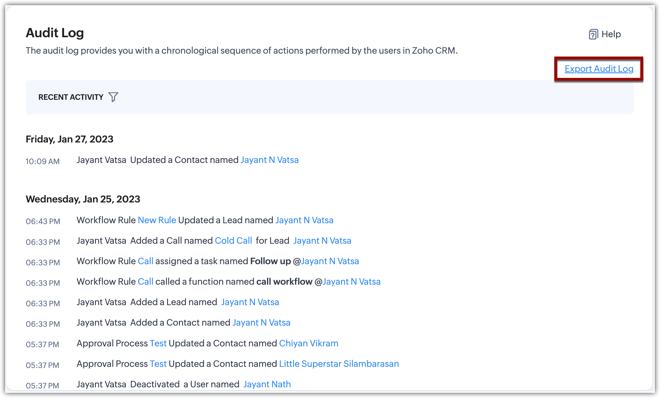 Doar administratorul contului Zoho CRM poate vizualiza intrările tuturor utilizatorilor din jurnalul de audit.