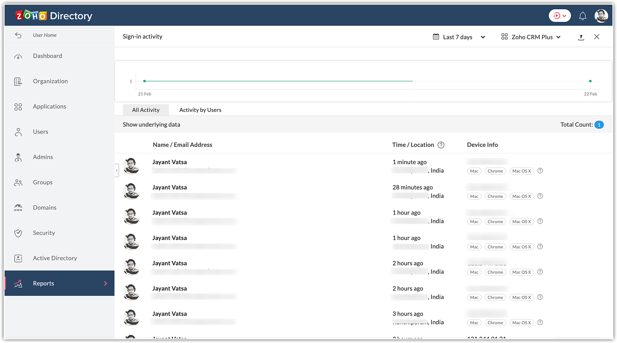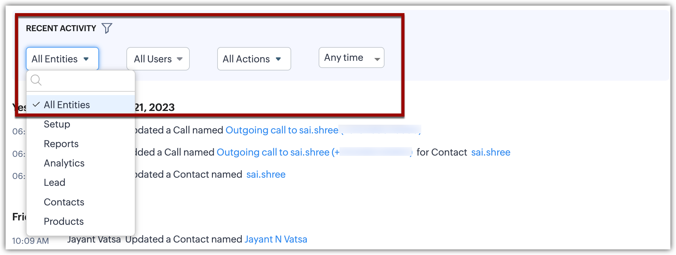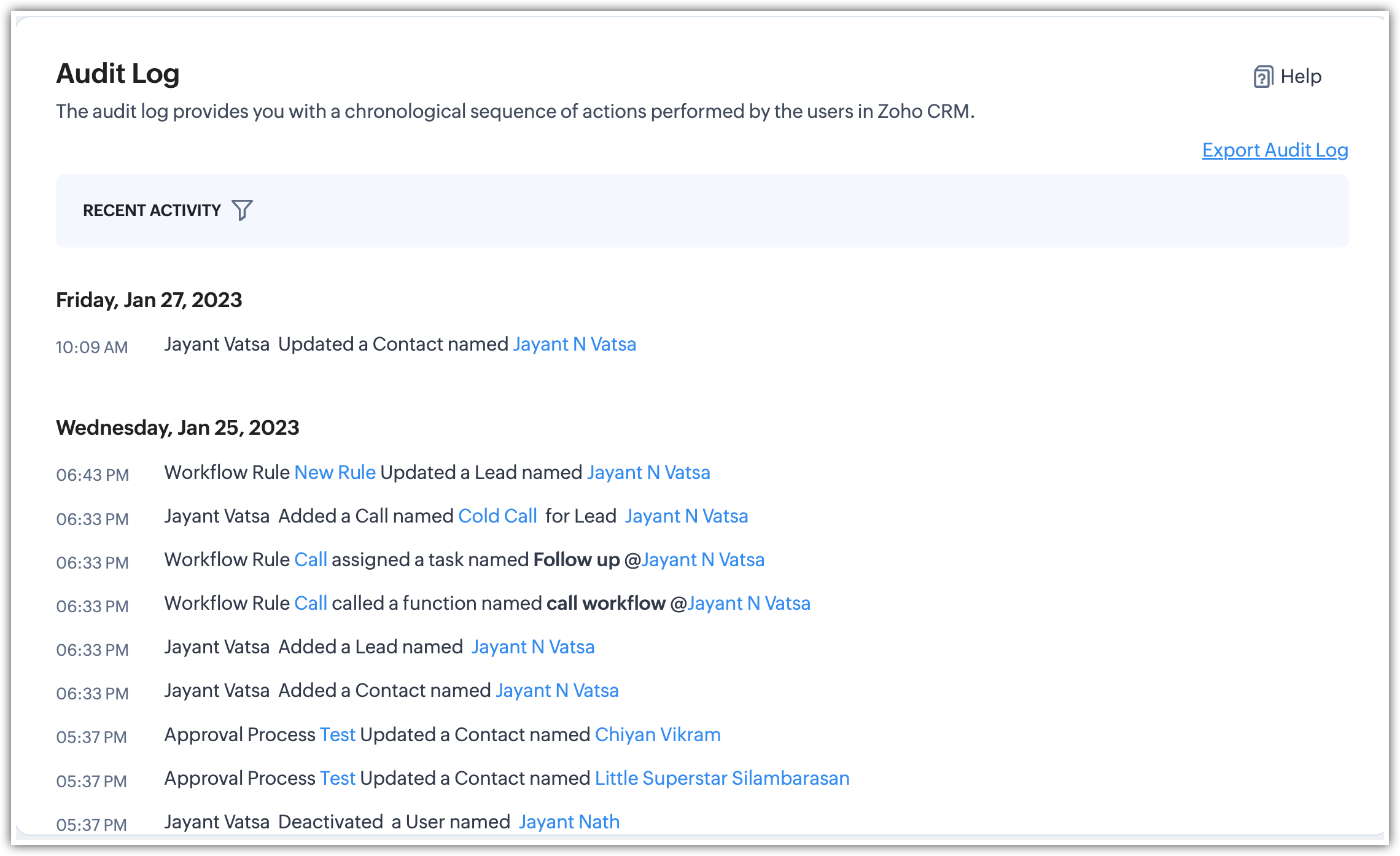Toți utilizatorii din contul tău Zoho CRM pot accesa jurnalul de audit. Cu toate acestea, utilizatorii non-admin pot vedea doar propriile acțiuni și pe cele ale subordonaților lor.