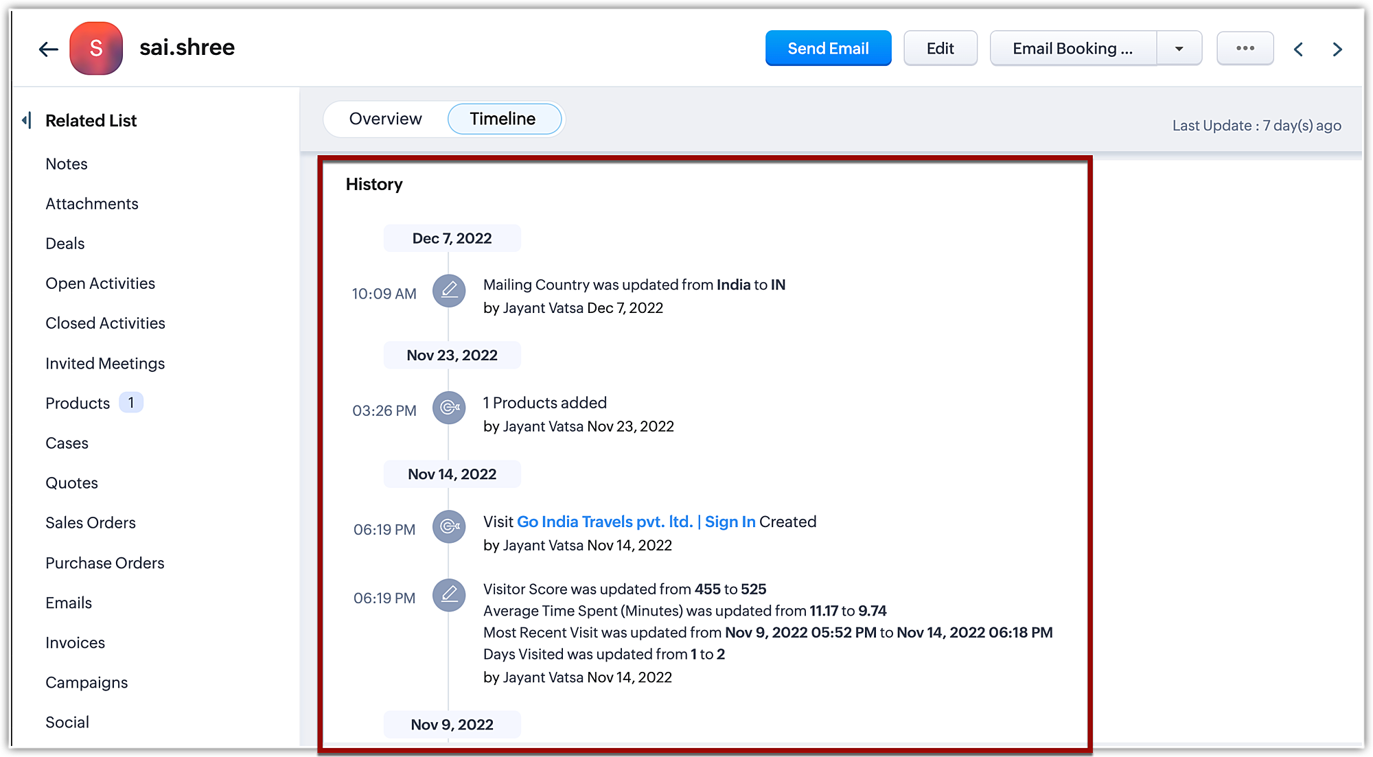Funcția Timeline din Zoho CRM este specifică înregistrării; adică este un istoric al tuturor acțiunilor efectuate asupra unei anumite înregistrări.