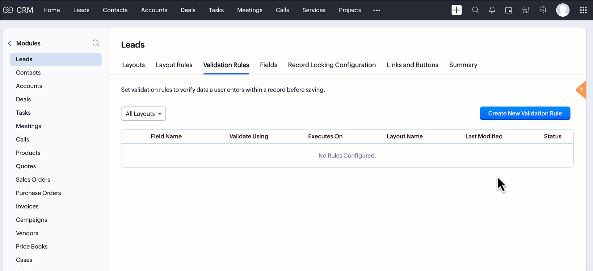 - Apasă pe Validation Rules pe pagina modulelor.