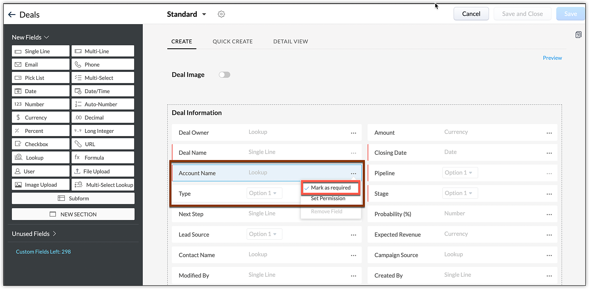 Dacă vrei să poți asocia un deal cu un lead pe măsură ce îl convertești într-un contact, urmează pașii de mai sus, dar în loc de câmpul Account Name, marchează câmpul Company ca neobligatoriu.