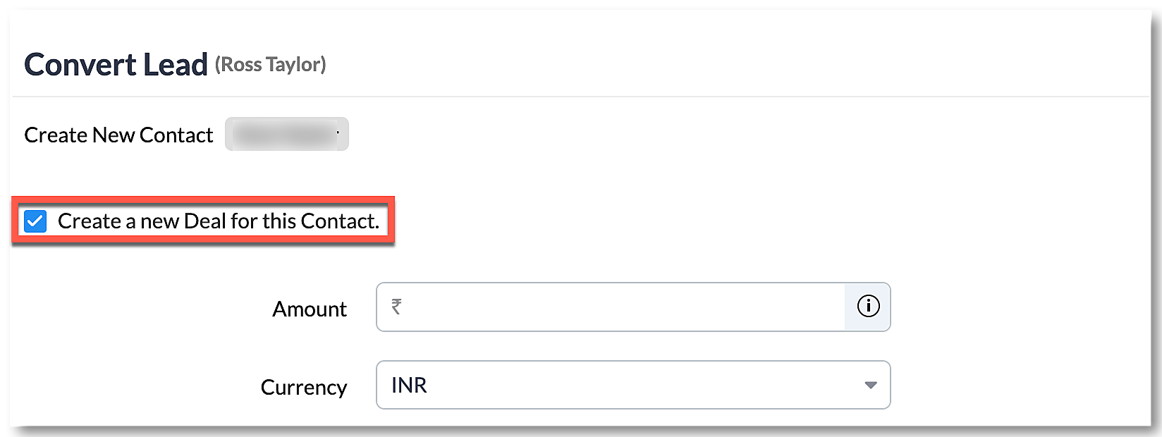 Nu completa numele Company la adăugarea unui lead. La conversia unui lead în contact, bifează doar caseta Create a new Deal for this Contact, completează detaliile și fă clic pe Convert. Ai asociat acum cu succes un deal cu un contact fără a crea un cont.
