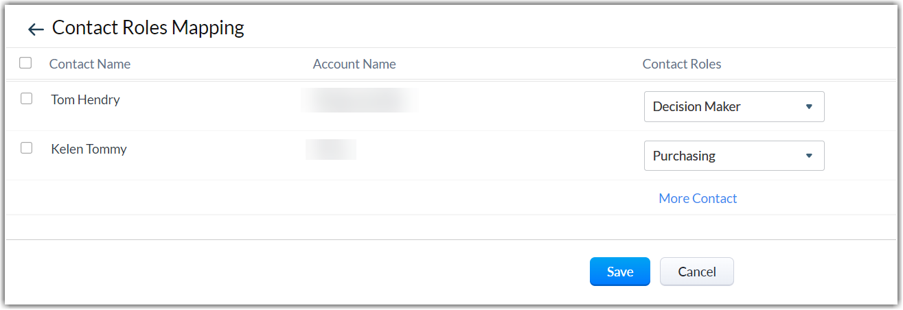 - În pagina Contact Roles Mapping, toate contactele asociate contului sunt listate.