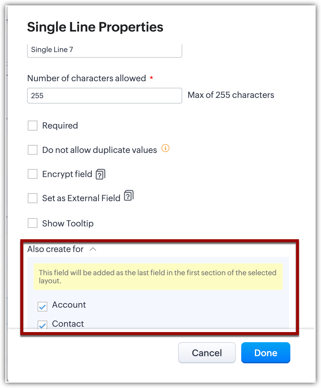 Când creezi câmpuri personalizate în modulul Lead-uri, ai opțiunea de a crea acele câmpuri și în Conturi, Contacte și Tranzacții.