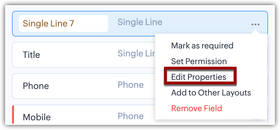 - Specifică detaliile câmpului personalizat și dă clic pe (...) de lângă numele câmpului și alege Editează Proprietăți din listă.