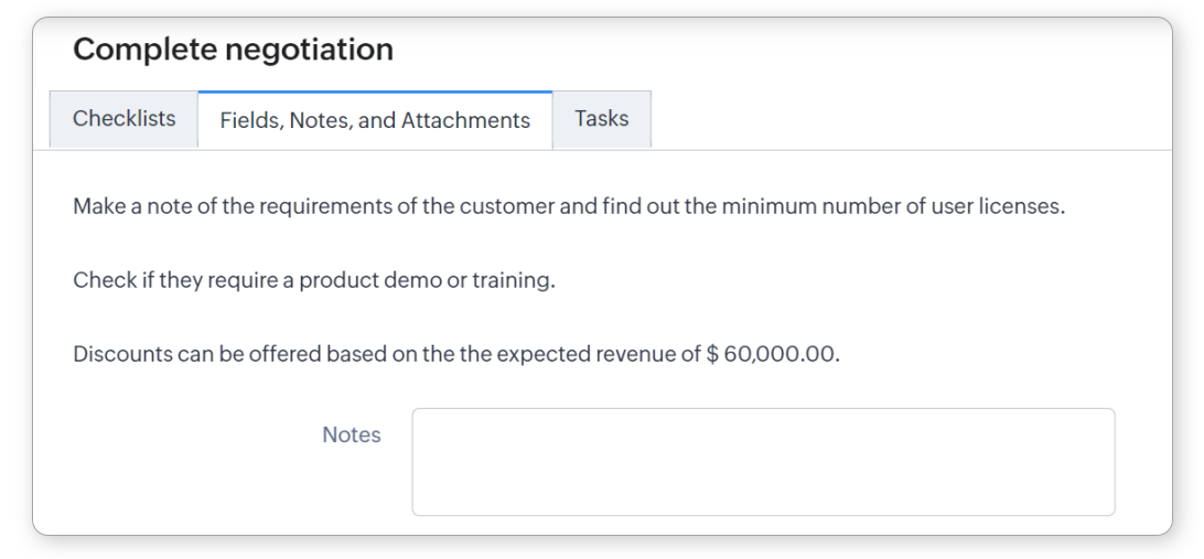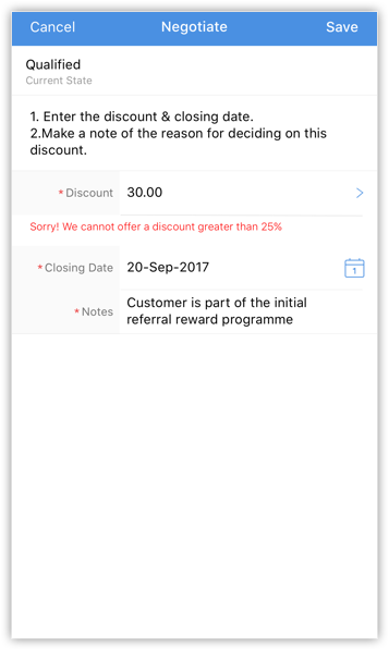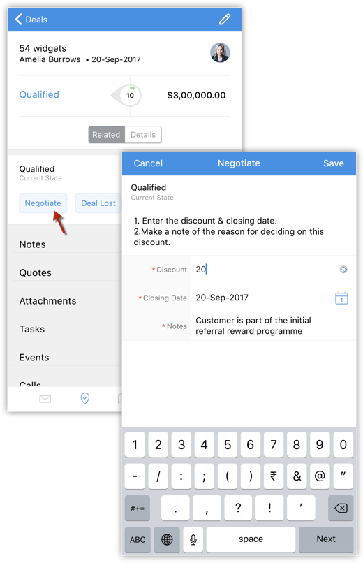 Un Blueprint pe care l-ai configurat în contul tău web Zoho CRM poate fi executat în aplicația mobilă. Să presupunem că ești într-o vizită pe teren la un client în legătură cu o tranzacție și aceasta a progresat de la Qualification la Negotiation. Poți actualiza stadiul chiar acolo, din aplicație.