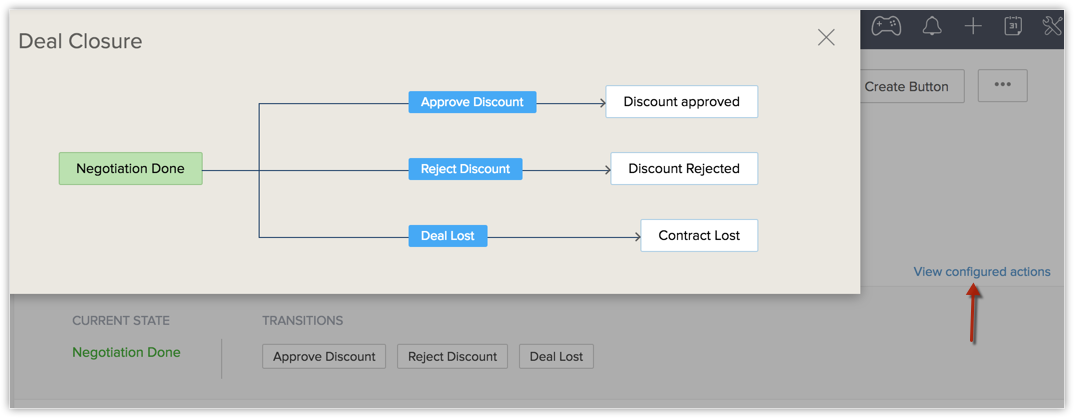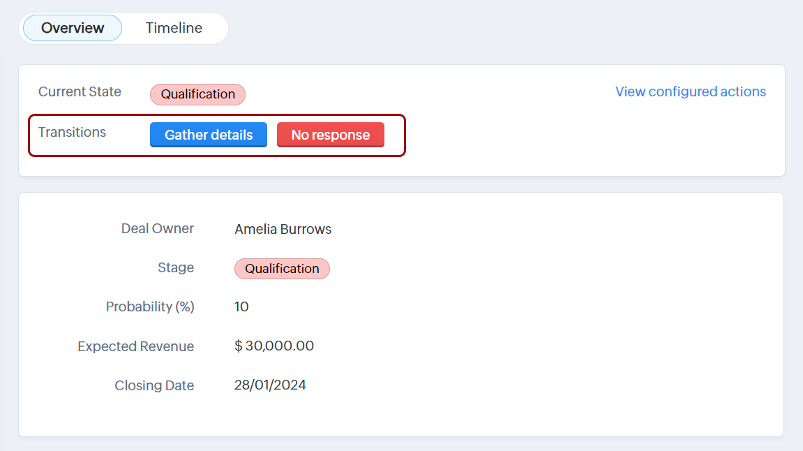 În contul tău Zoho CRM, pagina de detalii a înregistrării afișează starea curentă a înregistrării și tranzițiile disponibile pentru acea stare. Pentru a executa o tranziție, apasă pur și simplu pe butonul de tranziție potrivit.