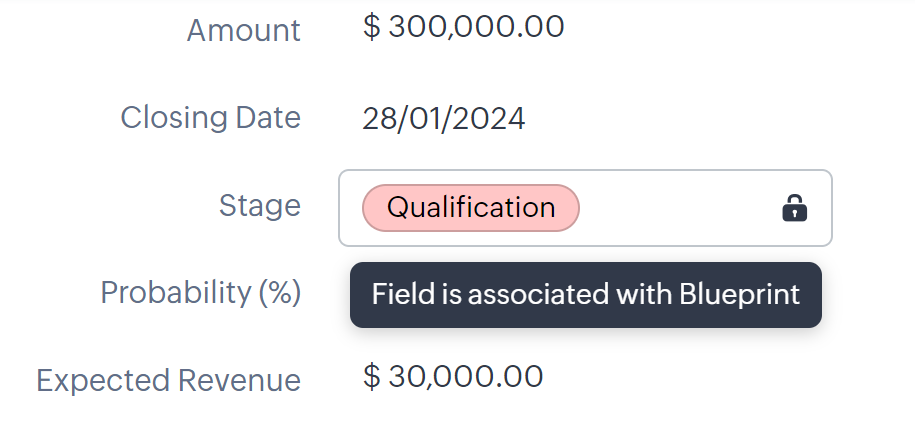 Aici, este important de reținut că câmpul folosit pentru configurarea Blueprint-ului va fi blocat pentru editare odată ce înregistrarea a intrat în proces. Adică, să presupunem că ai configurat un Blueprint pentru procesul de follow-up al tranzacțiilor folosind câmpul Stage. Odată ce o înregistrare a intrat în Blueprint, nu poți actualiza manual Stage-ul până când Blueprint-ul nu a fost executat complet.