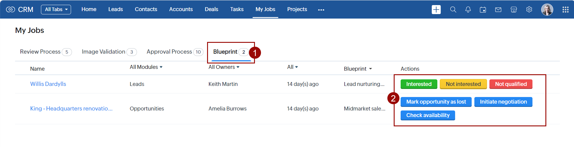 Odată ce înregistrările îndeplinesc criteriile de intrare ale unui Blueprint, acestea devin înregistrări active în proces. Un Blueprint poate fi executat în contul tău web, precum și în aplicația mobilă Zoho CRM.