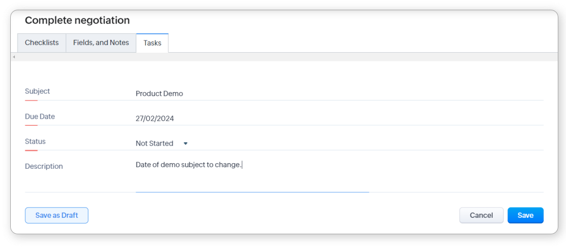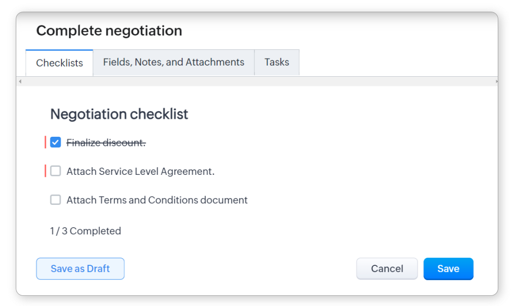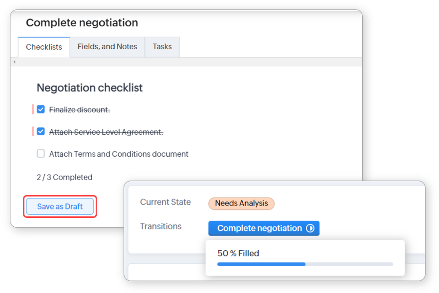- Salvarea parțială a unei TranzițiiCând impui o cantitate mare de informații în timpul unei tranziții, s-ar putea să nu fie întotdeauna posibil să le introduci pe toate dintr-o dată. De exemplu, în tranziția Finalizare negociere, poate ai completat toate câmpurile obligatorii, dar ai nevoie de mai mult timp pentru a bifa elementele din checklist referitoare la documentele SLA. S-ar putea să fie nevoie să adaugi și să modifici nota care trebuie adăugată pe parcursul câtorva zile. În acest caz, poți folosi Save as Draft. De exemplu, poate 5 din 10 detalii pe care le-ai introdus vor fi salvate momentan, dar înregistrarea va rămâne în stadiul prezent.Poți reveni la această înregistrare când ești pregătit, să introduci restul detaliilor și să salvezi tranziția. Odată ce toate detaliile cerute de setările During Transition au fost completate, înregistrarea va fi mutată la starea următoare din Blueprint.