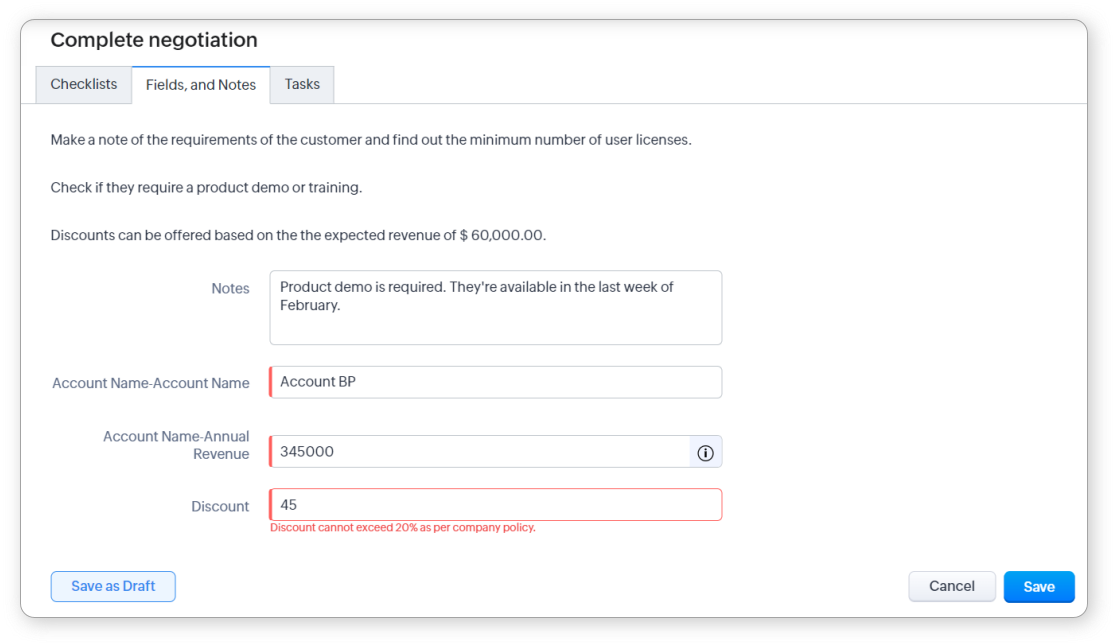 - Completarea câmpurilor și validăriDacă ai configurat câmpuri obligatorii și opționale din modulul principal Blueprint și din modulele asociate, proprietarul tranziției va fi solicitat să introducă valorile pentru aceste câmpuri aici. Dacă ai configurat și criterii de validare pentru oricare dintre câmpuri, sistemul va verifica regula de validare și va permite salvarea modificărilor doar când valoarea îndeplinește criteriile.Aici, o reducere de peste 20% generează o eroare: