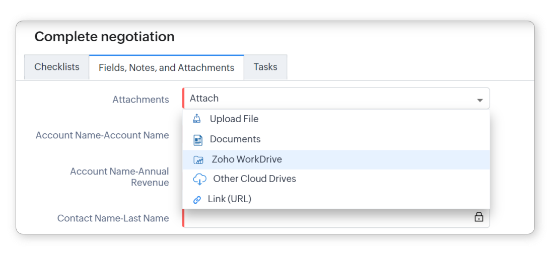 Dacă ai impus atașamente obligatorii, acestea vor fi solicitate în tranziție, așa cum se vede în imaginea de mai jos. Acest lucru este similar cu lista asociată Attachments, unde poți încărca documente de pe desktop, Zoho Workdrive, tab-ul Documents, alte servicii cloud sau un atașament URL.