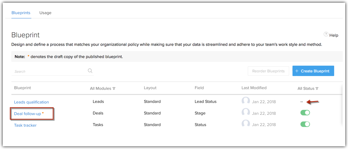- Versiunea ciornă: Dacă un Blueprint este salvat ca ciornă, înseamnă că nu este încă implementat în configurarea CRM activă, dar este disponibil pentru a experimenta, fără a afecta înregistrările existente.