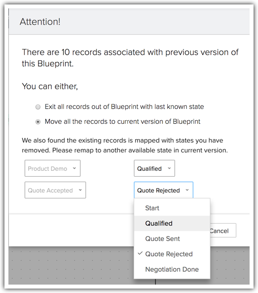 - La editarea unui flux Blueprint, dacă ai șters una sau mai multe Stări, când îl republici, vei fi solicitat din nou fie să muți înregistrările existente la cea mai recentă versiune a Blueprint-ului, fie să le scoți din proces. Dacă alegi să le muți la versiunea curentă, vei fi solicitat să remapezi Stările șterse cu cele disponibile în fluxul Blueprint modificat.