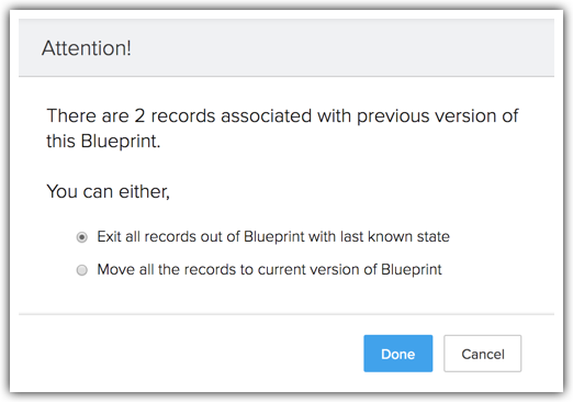 - Dacă ai șters un Blueprint și ai avut înregistrări active în el, vei fi solicitat să scoți înregistrările din proces.