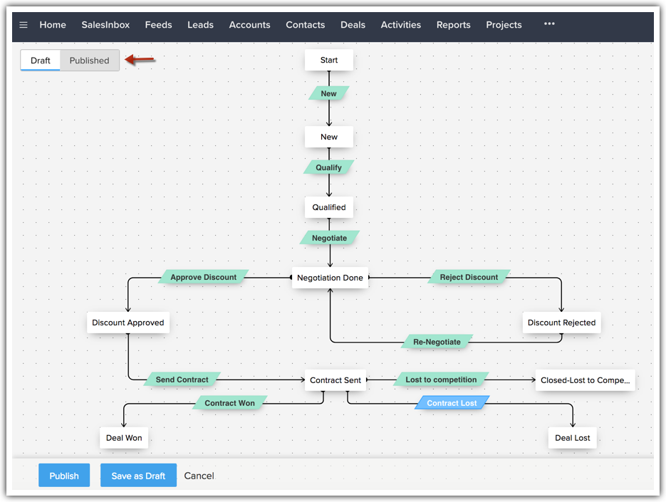 Se întâmplă uneori să nu fii pregătit să implementezi Blueprint-ul final în CRM și să ai nevoie de mai mult timp pentru a gândi fluxul procesului. Când publici un Blueprint, înregistrările vor începe să intre în el - deci nu este o idee bună să îl implementezi înainte să fie gata. În acest caz, poți salva un Blueprint ca CIORNĂ.